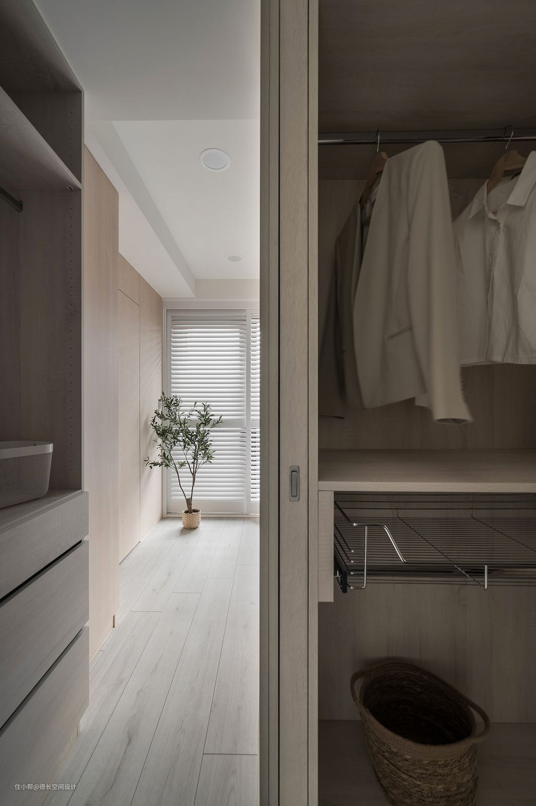 衣帽间左侧为长衣区,右侧为短衣区,抽拉式穿衣镜不占空间,方面使用 。