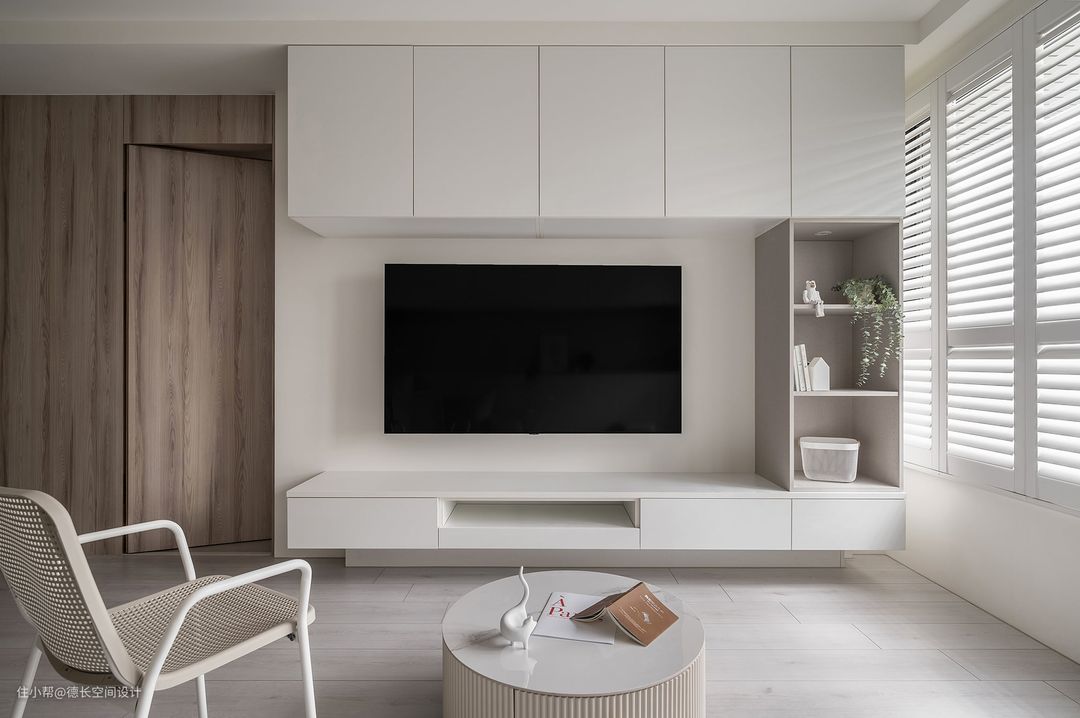 电视背景墙设计柜子,奖电视完美纳入其中,视觉上更显统一,悬空电视柜丰富视觉层次,也便于下方空间日常清理。