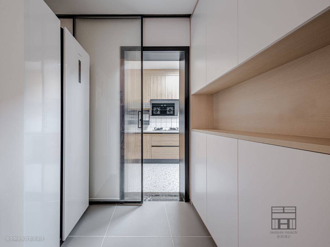 厨房以吊轨门的形式来解决油烟问题,也方便打扫卫生,门采用了超白长虹玻璃的材质来体现美观及保留透光性 冰箱放在厨房的门口,方便拿东西,右边定制了和鞋柜相同材质、颜色的柜子,进行收纳 #门#冰箱#柜子