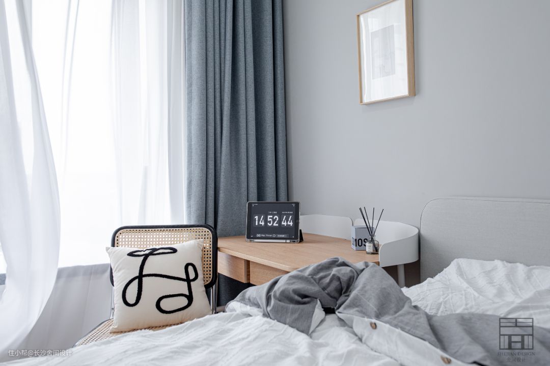 把“ 灰 ” 与 “ 木 ”融入在同一空间中有着非常契合的美感 墙面运用了两个装饰品,让整体空间看起来没有那么空 #墙漆#次卧#床