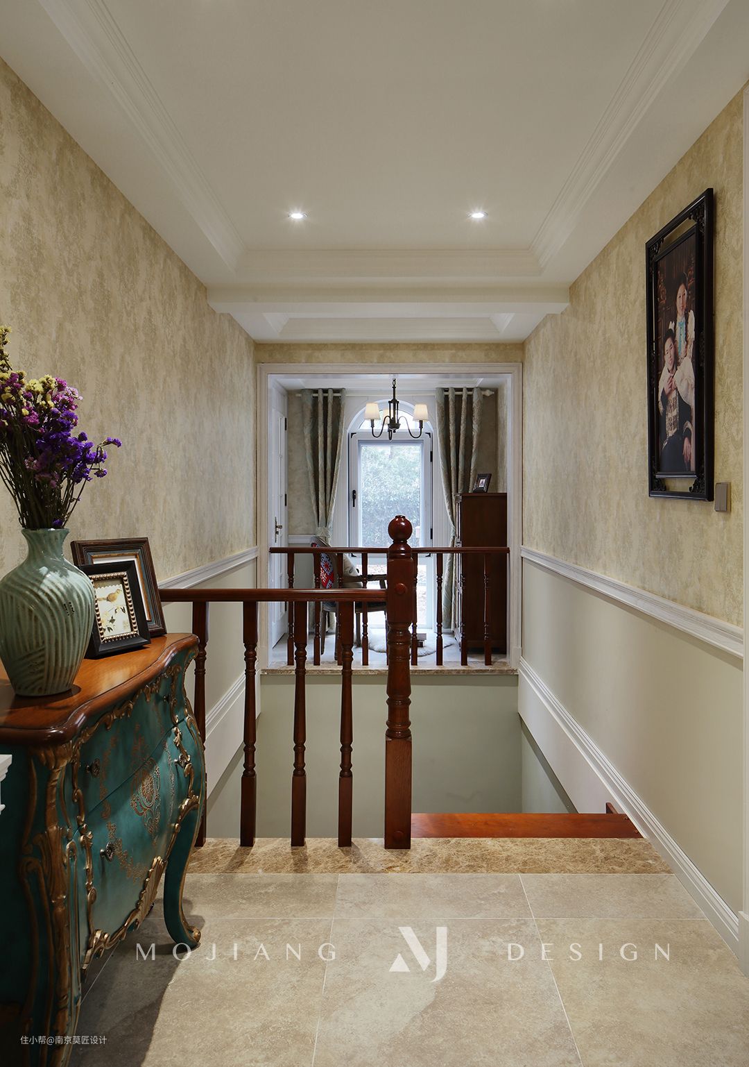 原书房空间较小,我们对此处空间进行了扩建延伸设计,改后的空间敲定当楼梯位置来用。简洁腰线+壁纸+乳胶漆组合产生柔和色差,给小小的空间带来耐人寻味的明净。纯白造型石膏吊顶在棕色扶手的衬托下更能增添空间的明亮轻盈, 楼梯的一角抓取特别的风情用来装饰,摆上描金浮雕巴洛克风格玄关柜,带来一丝丝低调的奢华感。