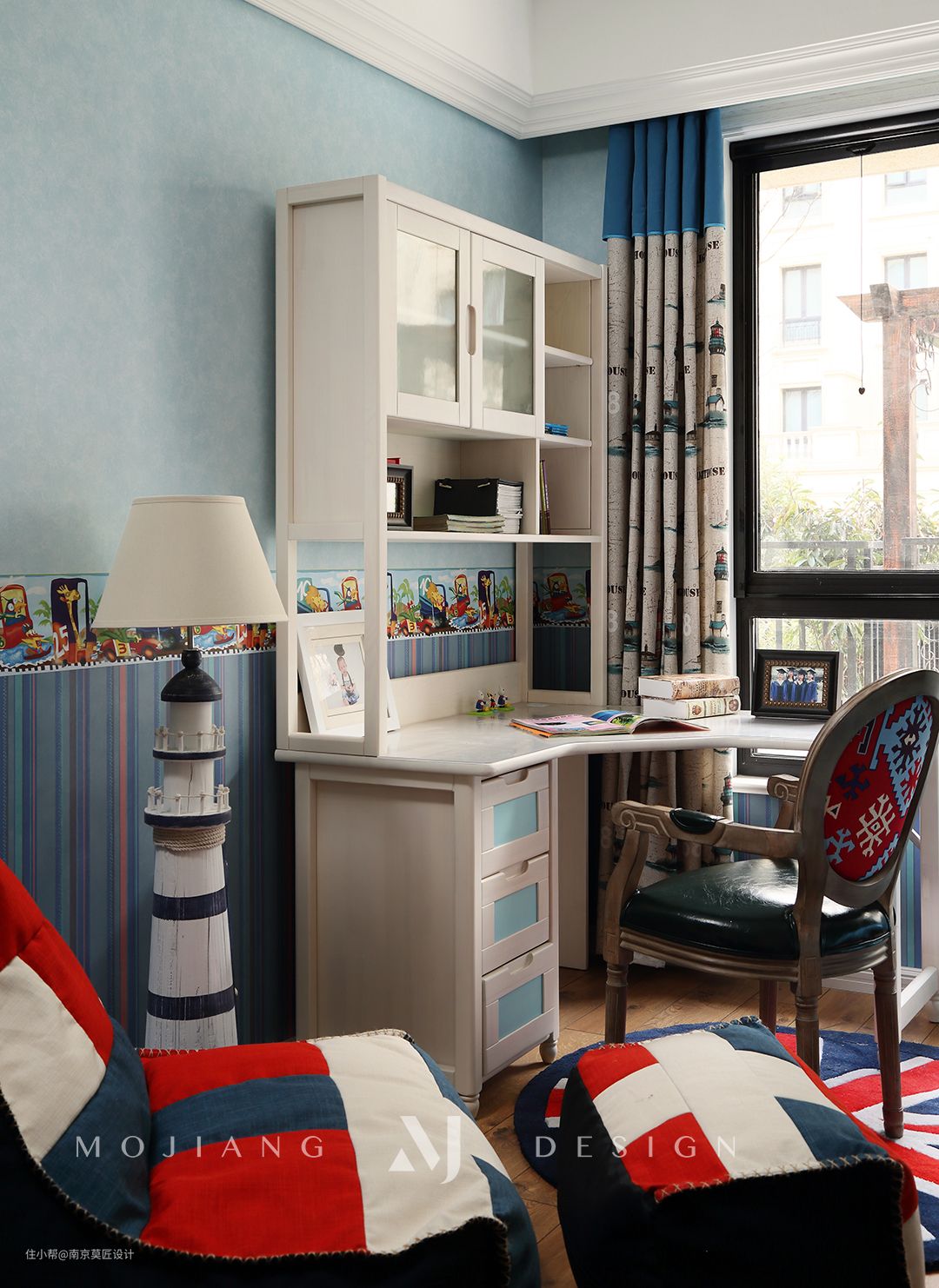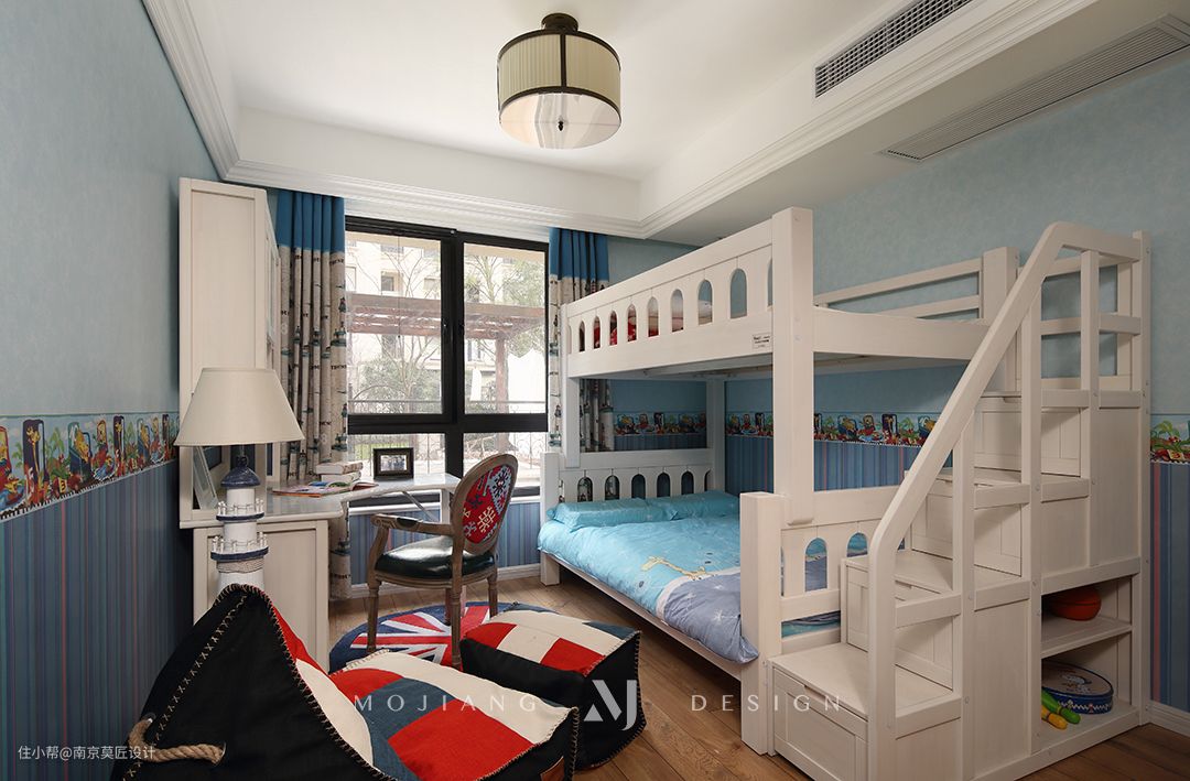 男孩的卧室,以蓝白色系为主调,营造清爽与活力的感觉,带抽屉楼梯的儿童上下床可以同时满足睡觉、娱乐、收纳等功能。通过对空间的合理规划,临窗安置配套书桌椅,让孩子在成长中所需的娱乐、学习硬件一应俱全。