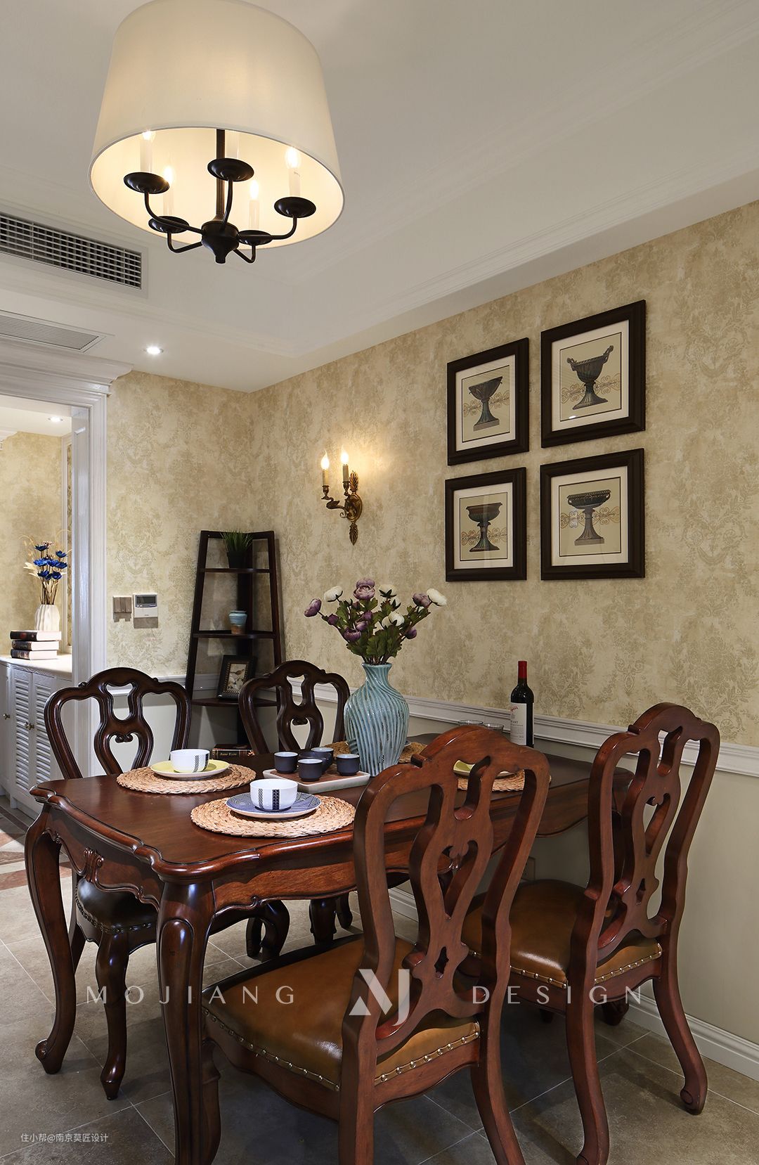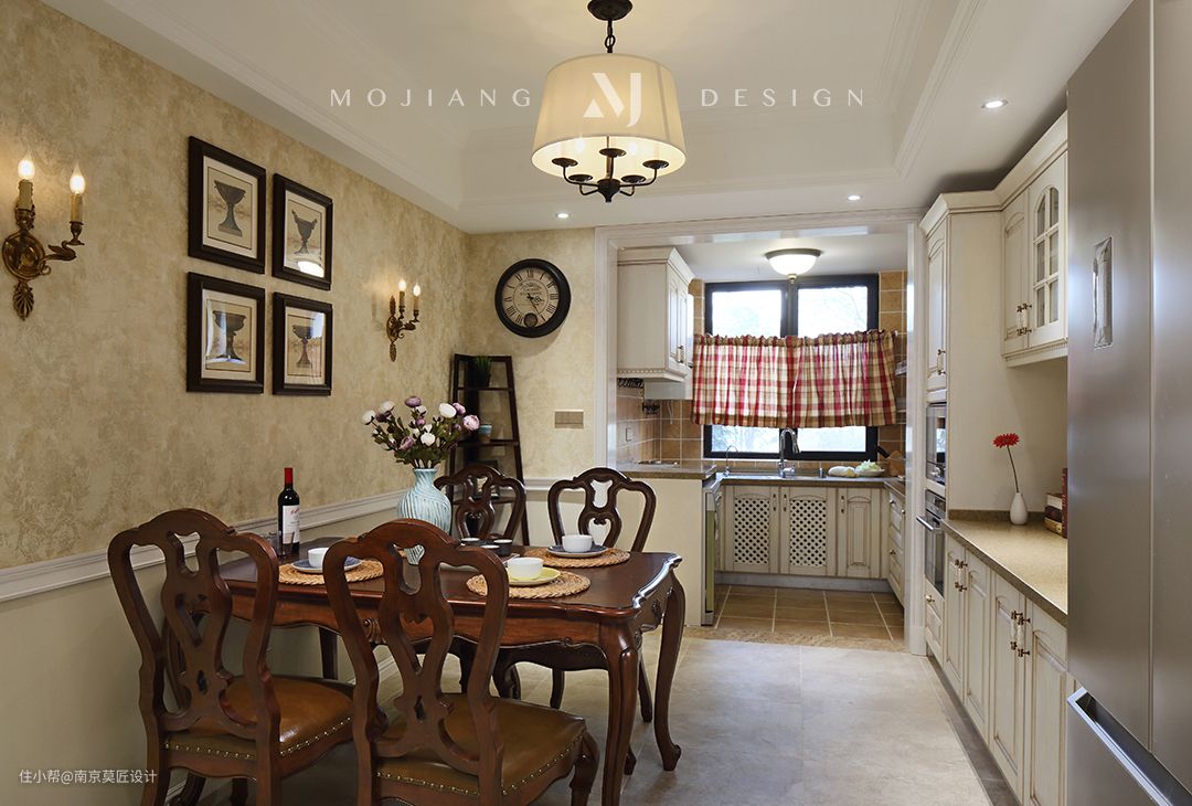 餐厅墙面延续了客厅壁纸+彩色乳胶漆的组合搭配,用简洁的腰线进行分割。美式实木餐桌椅细节处理十分考究,雕花线条处凸显着家居生活的品质感。餐桌旁别具一格的陈列架,实用而美观。餐厅吊灯意境十足,用餐时间都变得美妙起来。