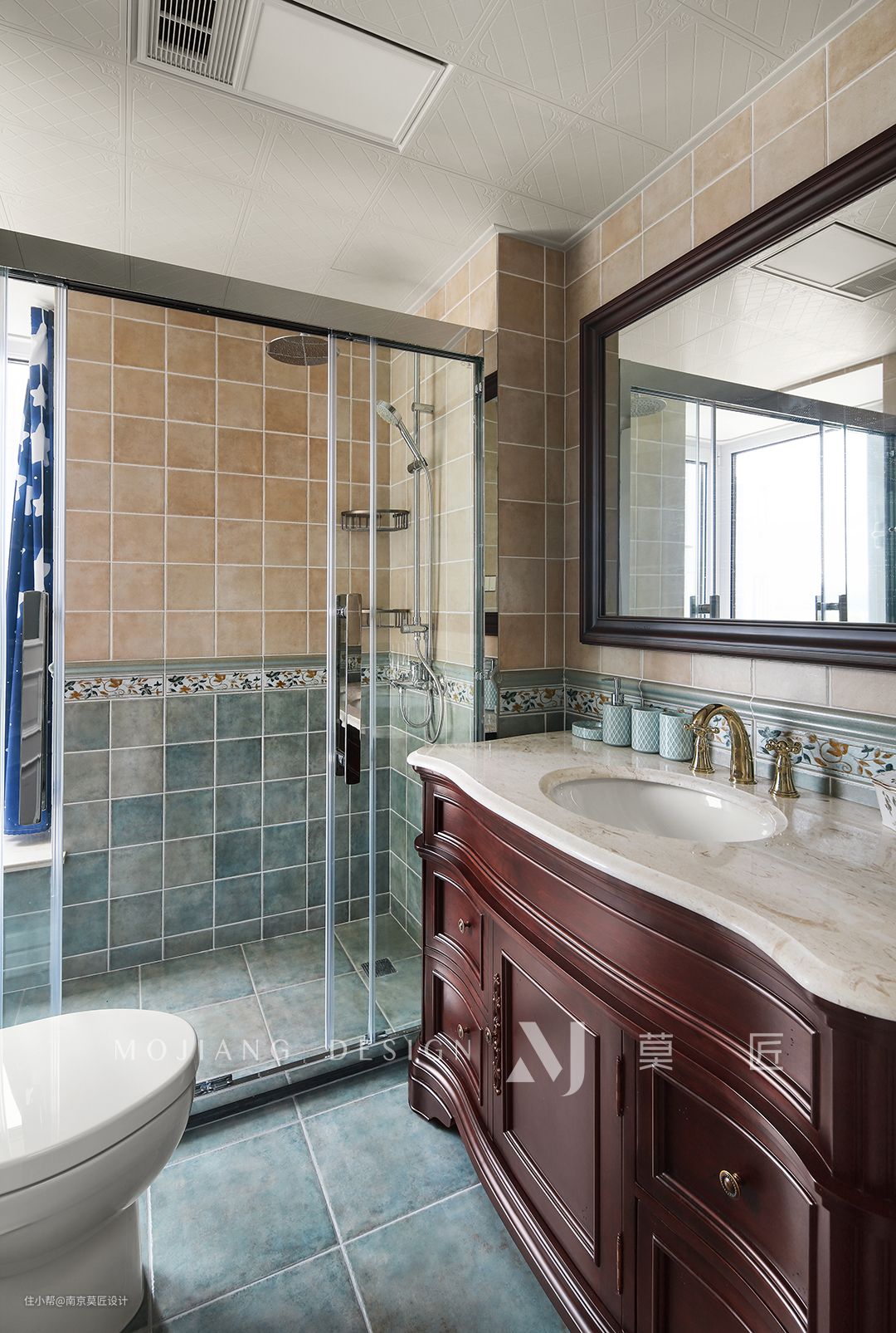 卫生间的仿古砖,美式经典搭配色。浴室柜延续了主卧空间基调。深色镜柜与台面的厚重感被一抹亮色中和,黄铜色五金配件提高了整体空间的颜值。