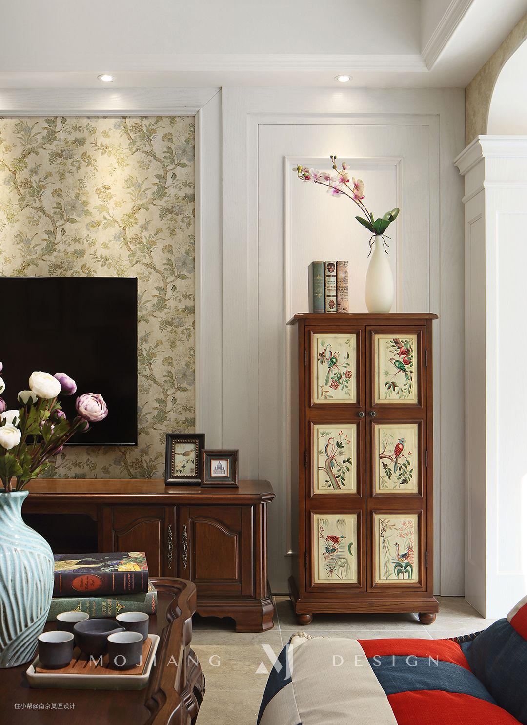 新古典主义的花鸟实木柜、凹凸层次的背景墙、浮雕立柱、处处可见审美的用心。