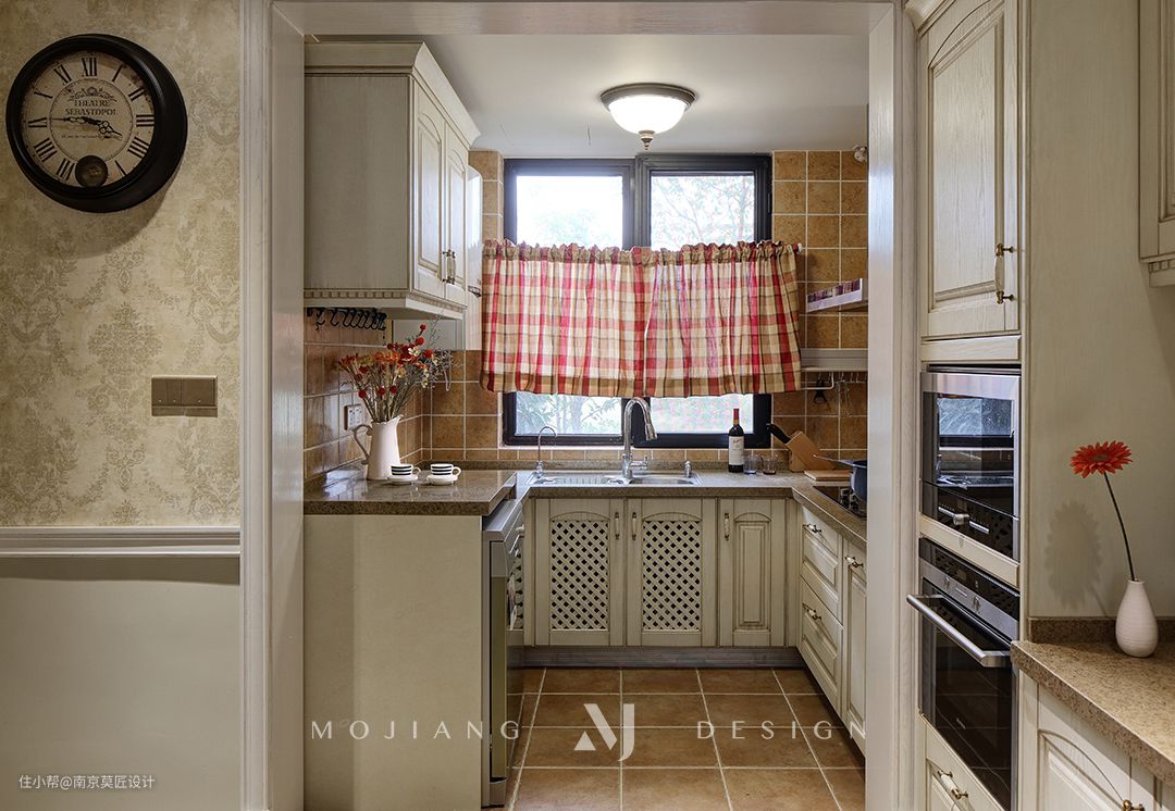 中厨延用美式风格,橱柜为U型设计,地面选用富有质感的仿古砖,墙面选用美式小方砖进行拼贴,非常活力。米灰实木橱柜与暖色瓷砖上下过度,空间尽显开阔敞亮,造型柜门更是被精心设计的最佳证明。餐厨之间无法拆除的部分承重窄墙,设计西厨柜时顺势包裹了进去。实木材质的运用让空间轻盈而有质感。
