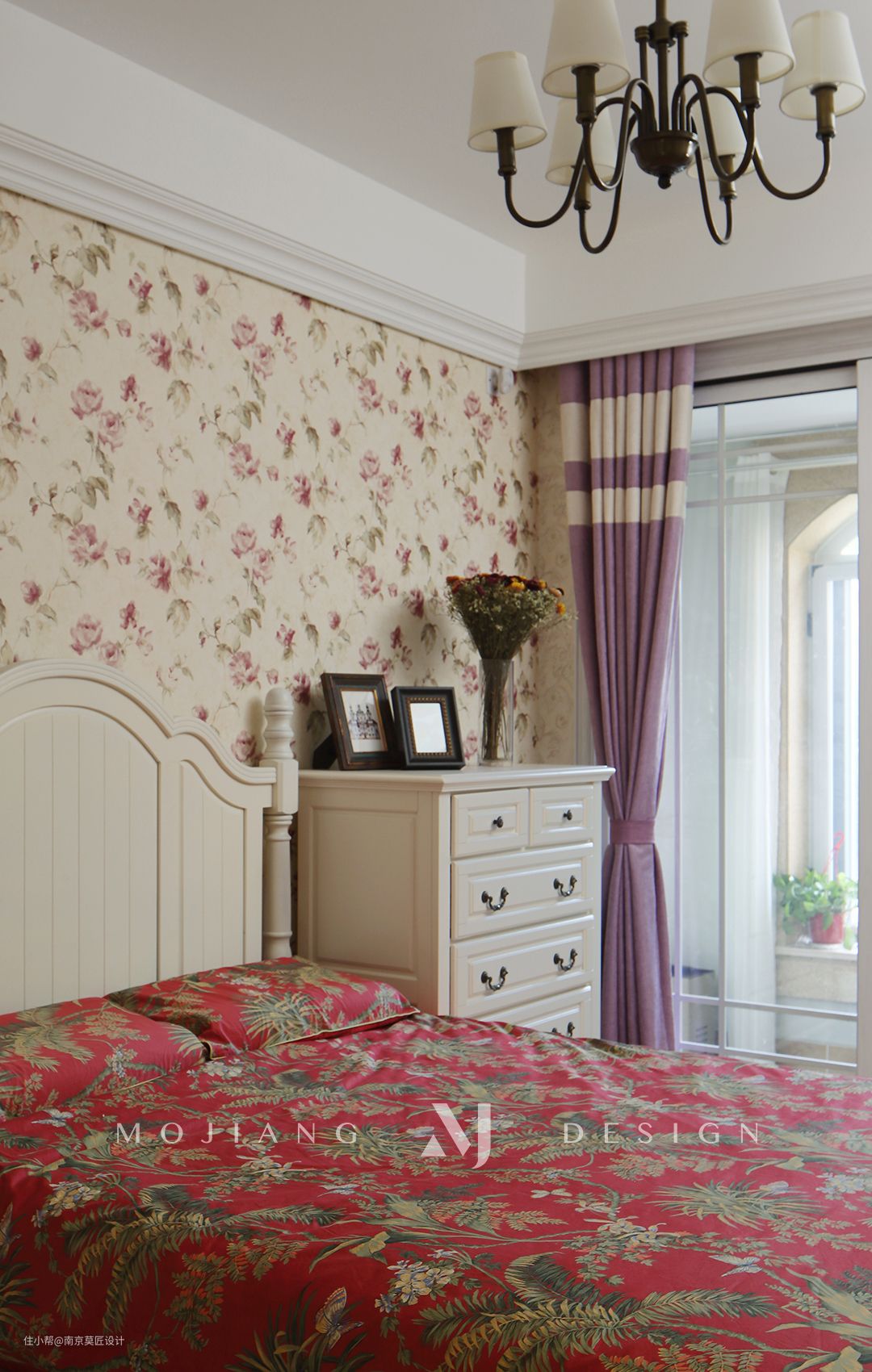 简洁大气的吊顶下挂将休闲轻松引入次卧,墙面贴近自然的碎花壁纸,宁静而舒适。