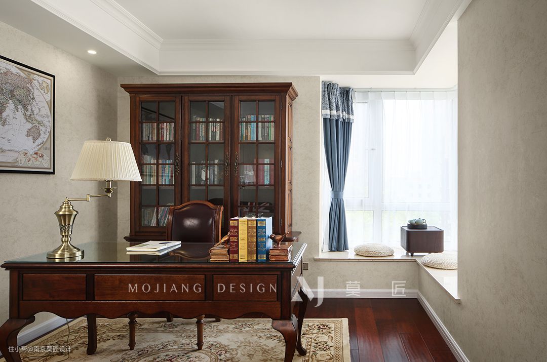 书房的整体布局简洁利落,极具美式情怀的书桌书柜,配上纯手工地毯,便是理想中舒适悠闲的办公/阅读空间。L字型飘窗开阔明亮,摆上蒲团和小几就可以成为休闲一角。