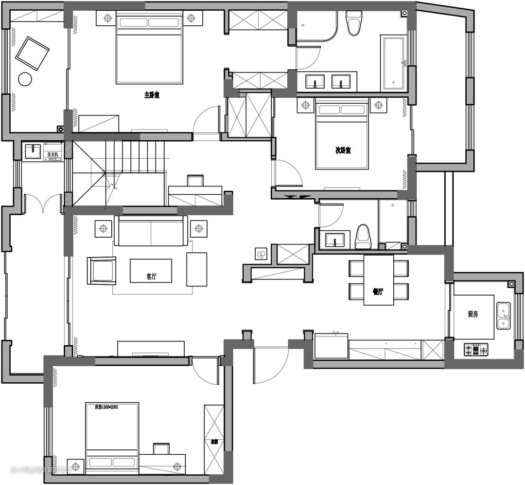 原始结构 1,进户空间没有得到很好的利用,空间浪费较多。 2,屋主对楼梯位置不满意,要改。 3,厨房相对较小,屋主已采购的洗碗机、蒸箱烤箱、冰箱、咖啡机等各种锅需要地方安置。 4,书房太小,满足不了屋主的需求。 5,次卧客卧空间都较小,没有衣柜的位置 6,收纳空间较少, 7,地下室的设计。