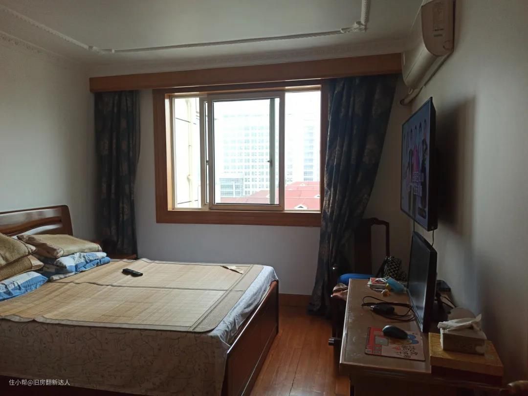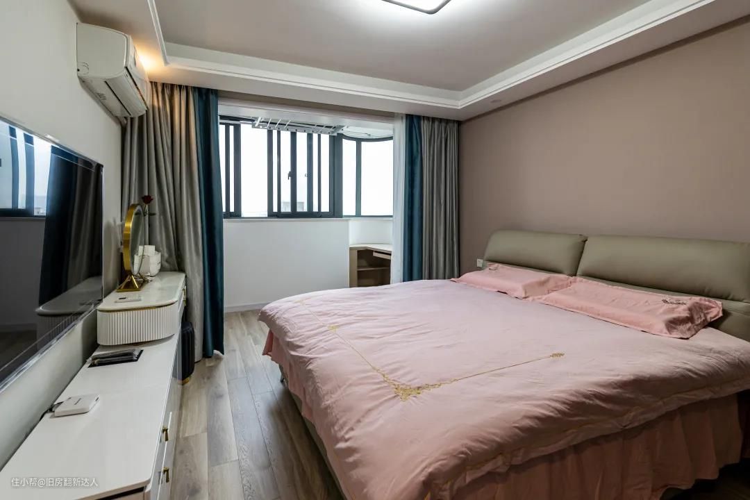 ▲改造后实景图 主卧。卧室区域和阳台区域打通,去掉了原来的移门,改用窗帘进行隔断。阳台空间没有浪费,不仅是一个晾晒的区域,也同样可以办公。