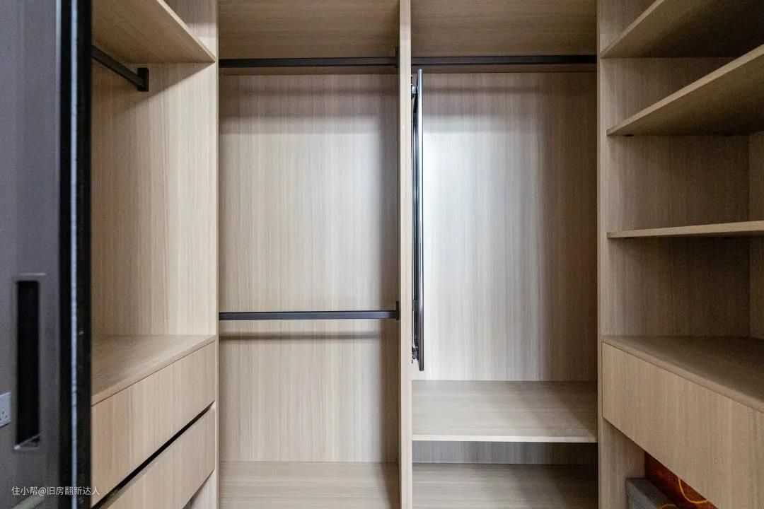 ▲衣帽间。深色的玻璃移门,形成了大气的镜面效果,不仅增加了空间的透视感,还有赏心悦目的视觉感。借用次卧空间打造了步入式衣帽间,实现了女主人想要一个衣帽间的梦想,基本能满足小夫妻的衣物收纳需求。