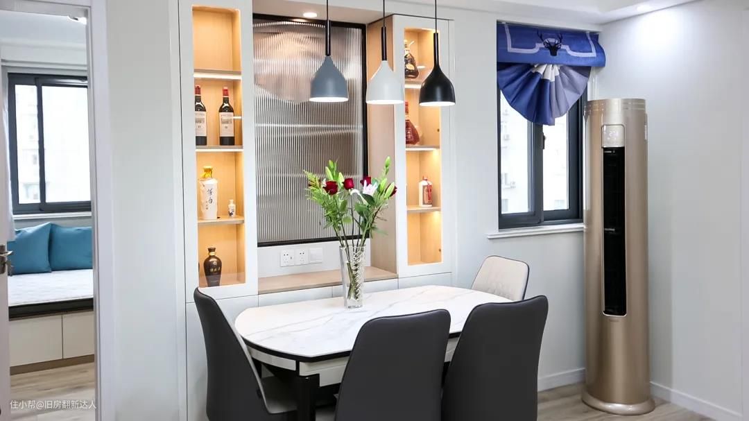 客餐厅动图。门开合的空间为主卧,餐厅和卧室之间,利用餐边柜的整体设计,进行了两个空间的隔断,原先的实墙被打通,引入长虹玻璃窗户,让儿童房可以适度借用客厅的采光,保证空间的通透性。