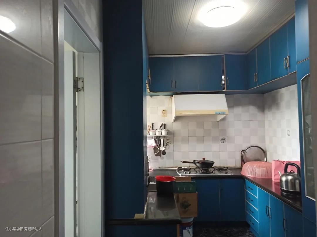 ▲改造前实景图 改造前的户型,基本算是方正。厨卫这里只有一个朝西的小侧窗,对于厨房来说,尺寸比例还可以,厨房有7㎡,卫生间有5㎡,都不算小,但动线已经不能符合未来家庭改变后的需求。