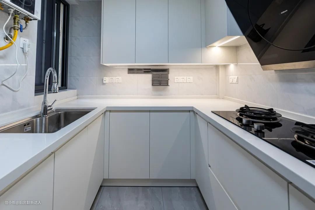 ▲改造后实景图 原始户型是先进厨房门,再进卫生间的动线,当然也有好处就是只有一条动线,但是也会导致两个空间“串味”,所以在本地改造中进行了两个空间独立化处理。 针对厨房,我们把洗、切、烧的动线进行延展,把厨房空间做成了U型,这样在切菜区可以放很多小电器,台面空间有2.2-2.3m。 烹饪区不需要通风,所以调换后就增加了切菜区的空间,和摆放电器的空间,洗菜区则有了很好的通风和采光。另外,台面高度为88cm,比过去抬高6cm左右,适应了业主一家使用需求。