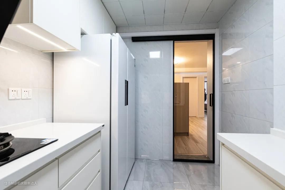 厨房和客厅之间,采用玻璃移门隔断,让整个家采光通透。经过精准的测量,双开门冰箱被放到了厨房门口的角落,冰箱上部也做了收纳柜 ,视觉整体性更强,空间利用更充分。