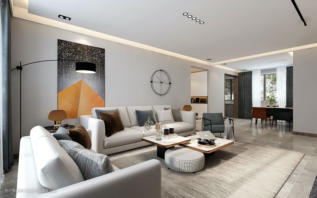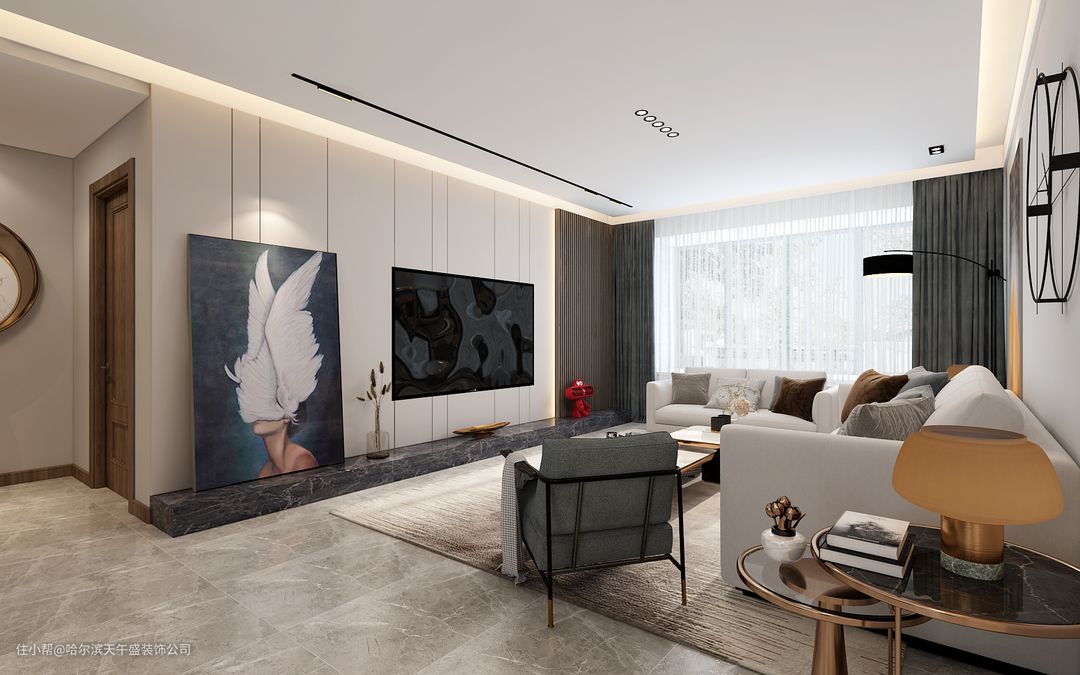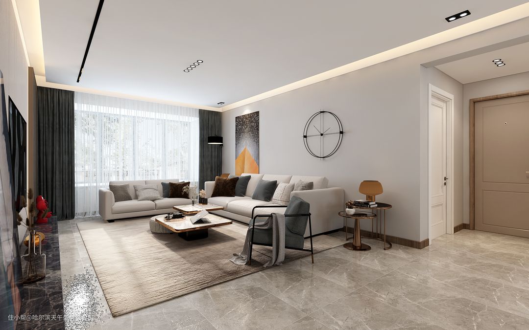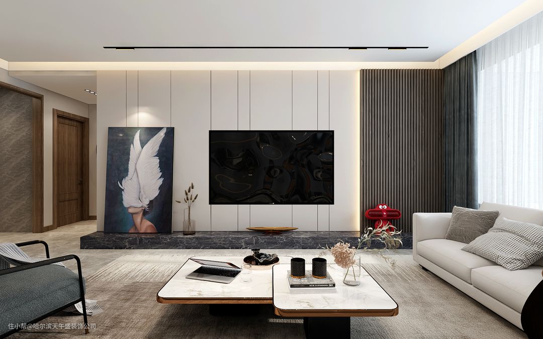 设计理念:客厅是无主灯的设计,客厅位置的跨度非常大,开始设计的是会议厅感觉的沙发,业主感觉有一些死板,更改了温馨一下的321沙发,背景墙做的是软包和隔山板的造型,更能凸显出风格的特点,整体棚面和墙面的造型都是四边形,沙发墙没有做更多的软装造型,采用的是饰品或挂画做后期的处理。