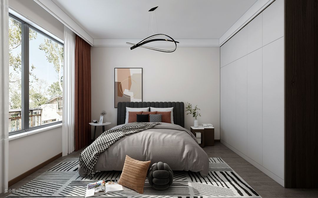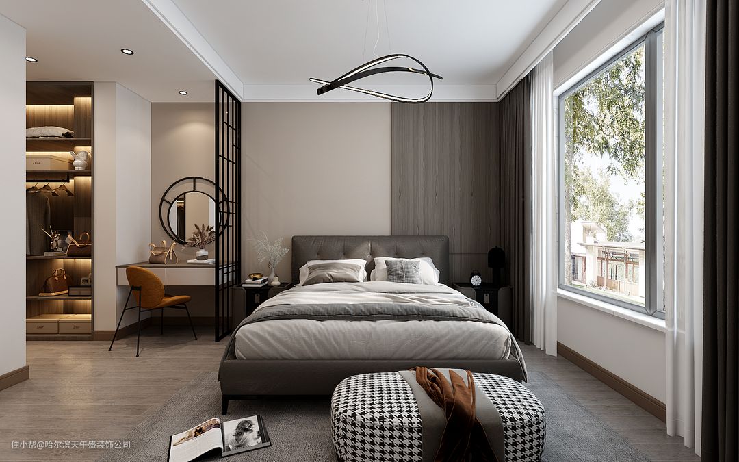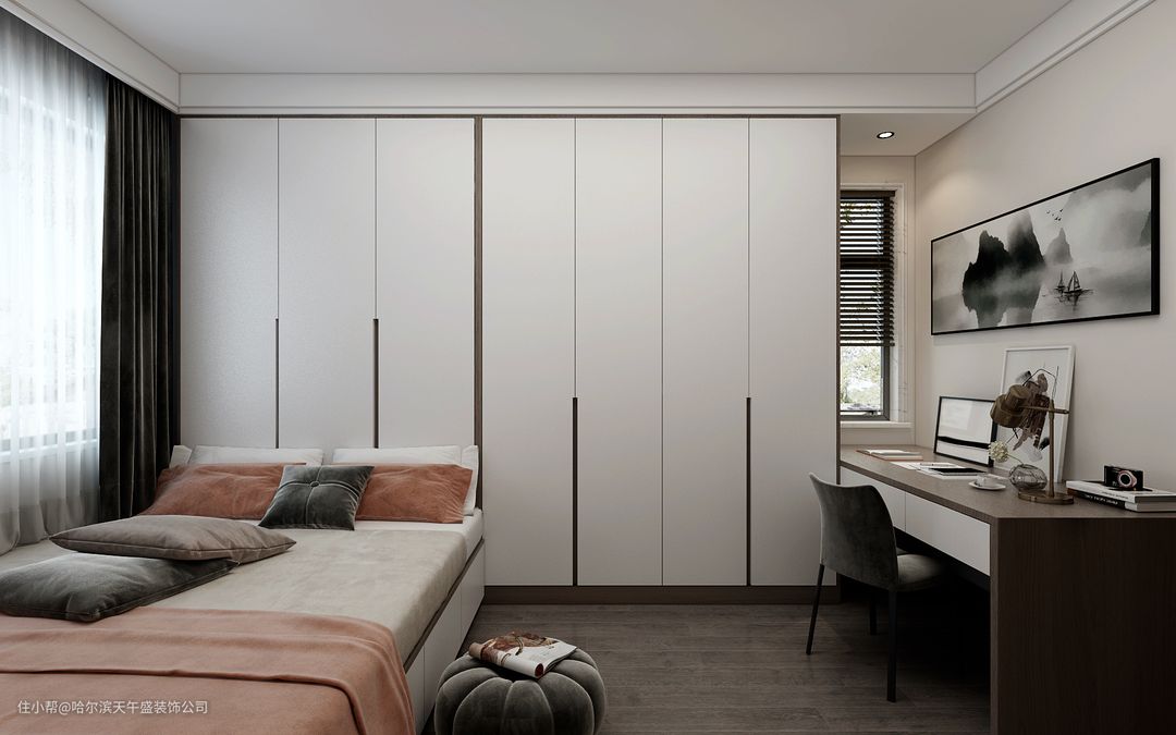 设计理念:卧室设计的一切都应该围绕著提高舒适性、方便性来展开:一般卧室的需求客户是要求最高的,因为涉及到舒适性和温馨感,小到一些细节都比较敏感,主卧室卫生间改为敞开式的衣帽间,梳妆台位置做的金属的隔断,和棚面造型衔接之后,整体出现了一个分界线,两个区域,客卧室是客房,做的是榻榻米,然后把原有的主卧卫生间的窗户改成了客房的窗户,在采光位置有一个学习桌和写字台的预留,次卧室老人住没有过多的改动和装饰。