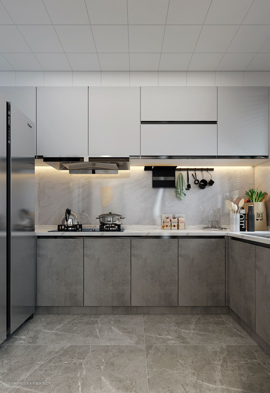 设计理念:厨房空间做敞开式厨房,本身厨房的空间就不大,恰好甲方没有镶嵌的电器的使用,多大的电器也没有,所以就做成了纯中式的厨房,平时在家做饭的都是老人,就没有做倒台的设计,把过廊的空间留到最大,活动空间达到了厨房的最大化。