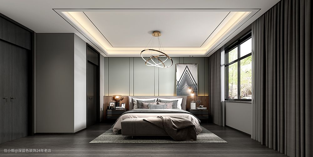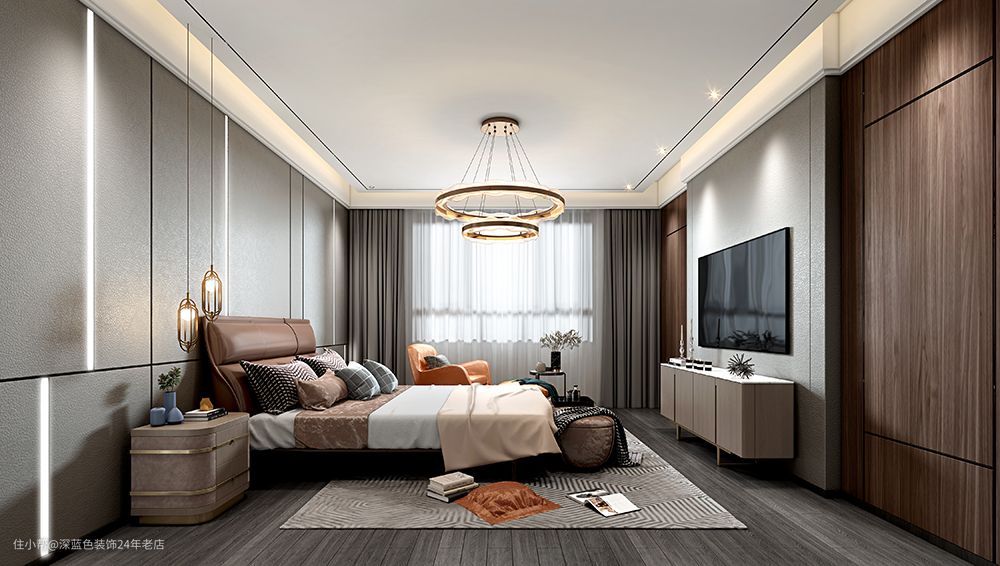 主卧比较豪华,床头背景墙增加了多条竖向的灯带,能够在视觉上拉高整体的高度,让人不会产生过大的压力。顶部这种吊灯比较有金属感,两层的样式让空间多了不少的层次感。