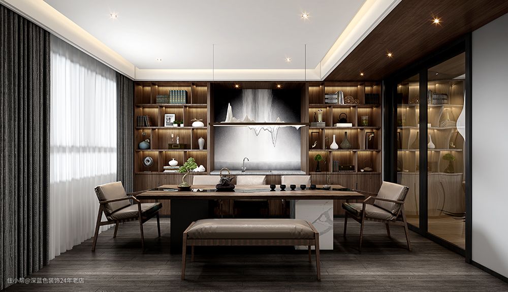 餐厅是一个半开放式的空间,左右对称式的餐边柜摆放了很多的摆件和藏酒,而且内部隐藏式灯带搭配上柜体本身的色调,这完全就是将现代风格的餐厅提到了一个新的高度。
