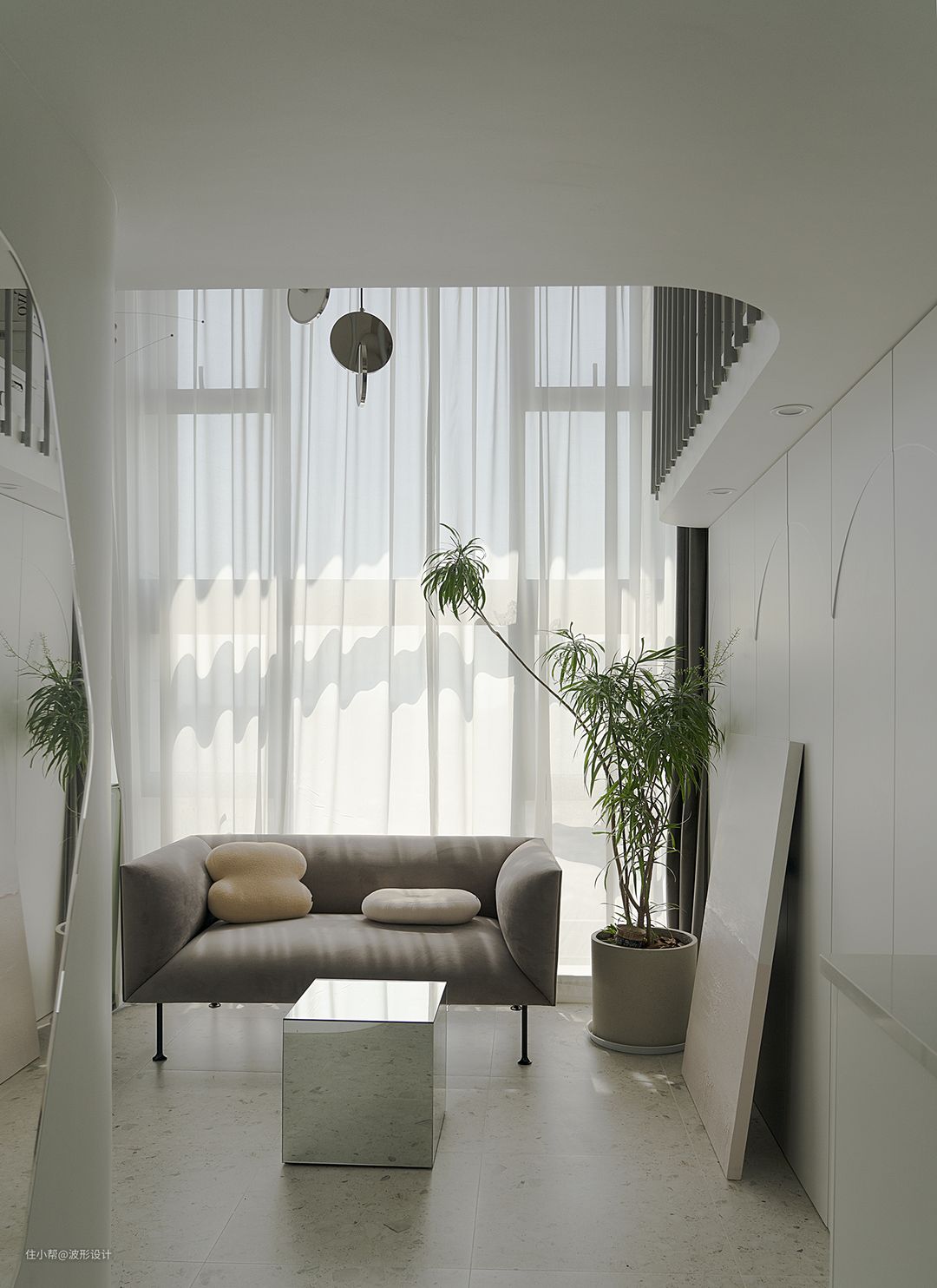 纯白纱帘与慵懒的沙发,打造了阅读角的舒适。一个随意躺下的沙发。草绿植物是代表生命力的符号,仿佛春回大地,纯白沉默的雪山,又有生机勃勃的一隅绿洲。