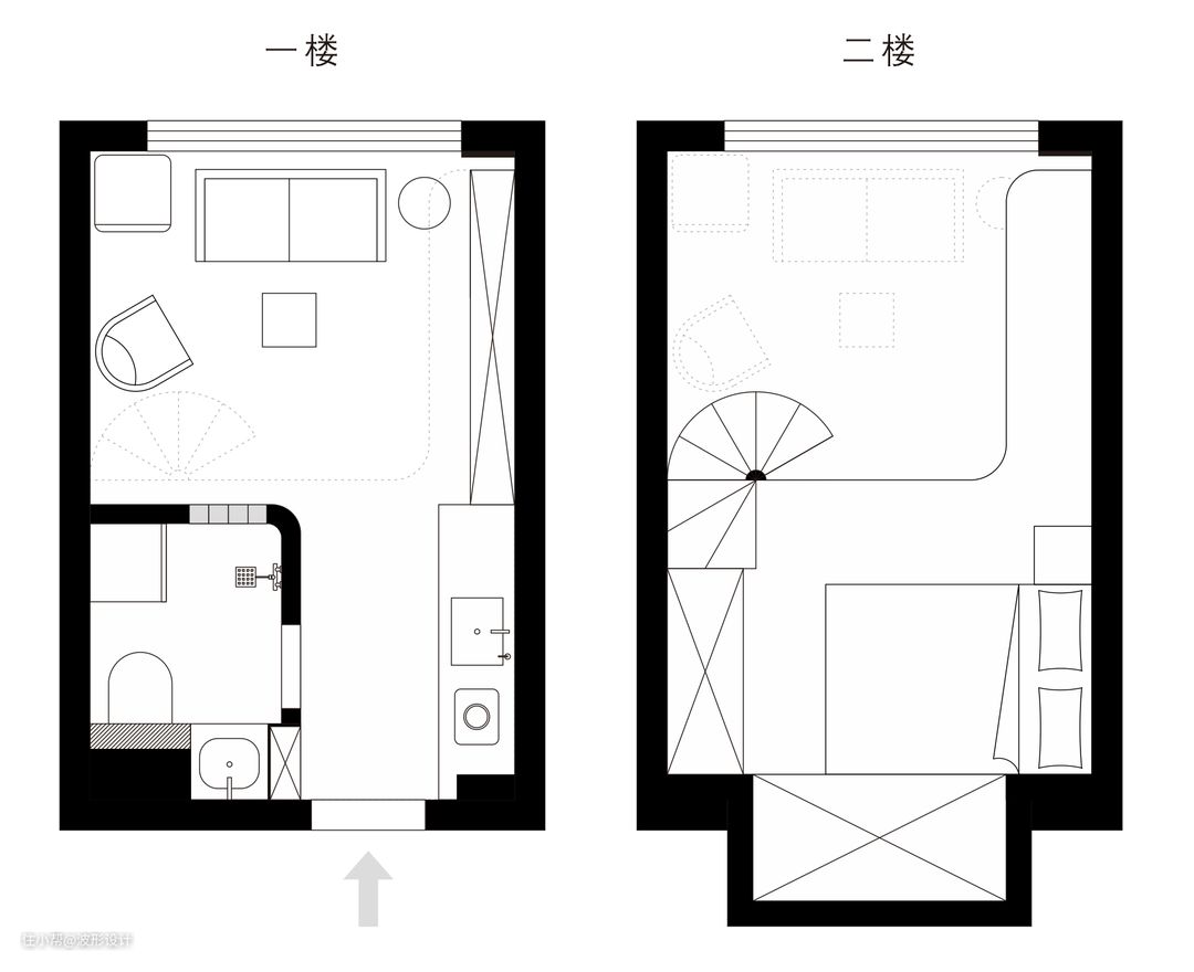 布局介绍: 一楼:进来左侧是卫生间,淋浴,壁挂马桶,洗手台,洗衣机都放置在一个区域,使用上互不干涉,卫生间为了增加采光选用水纹玻璃砖,透光不透人恰到好处。 到客厅右侧有2米多长的大立柜,方便平时放杂物。左侧是超大投影墙,适合迷你家庭影院,楼梯下方存放折叠餐桌椅,方便朋友聚餐不占空间。 二楼:从旋转楼梯上来,左侧及下方拥有两个大衣柜收纳非常充足,右上方延伸处为增加延伸活动空间,能坐着看电影也是方便给猫来回跑。