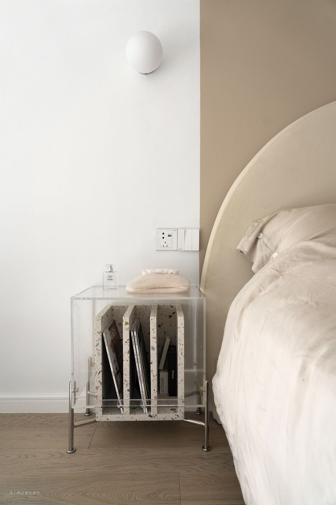 主卧以奶茶色为主调,依旧延续了一楼半拱形以达到风格连续性,背景色块的延伸使空间更有整体