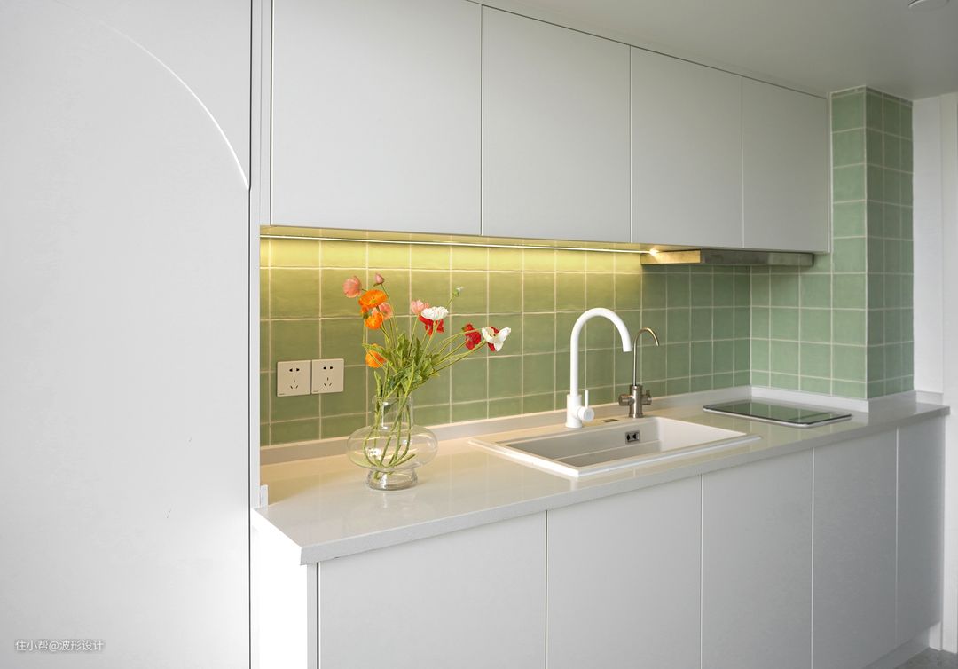 复古绿瓷砖搭配极简的橱柜,和谐的材质与暗含秩序的造型线条,品质感悦然而升