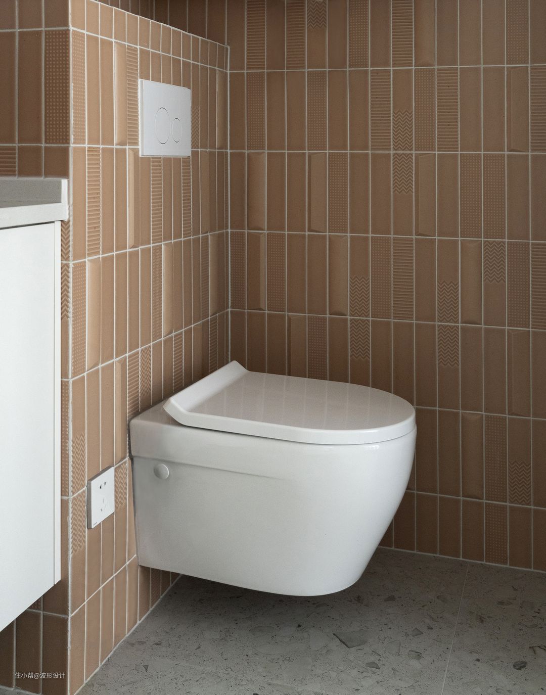 在极小的空间,要满足设计感很有挑战性,具有纹理的小砖最适合不过了,不同的纹理亚光质感不规则排列,又不失精致