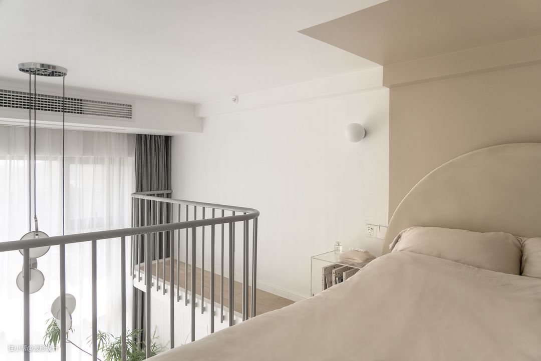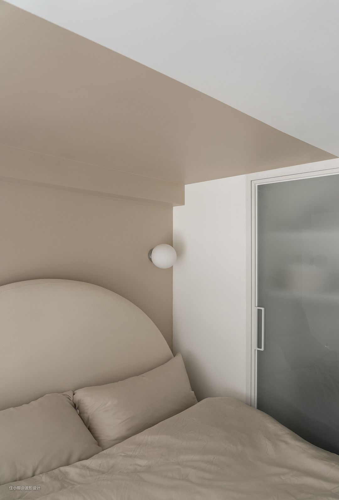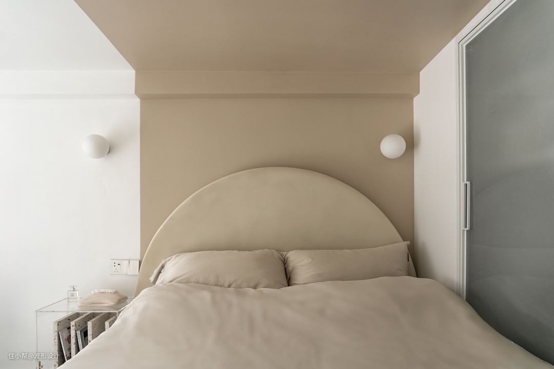 主卧以奶茶色为主调,依旧延续了一楼半拱形以达到风格连续性,背景色块的延伸使空间更有整体