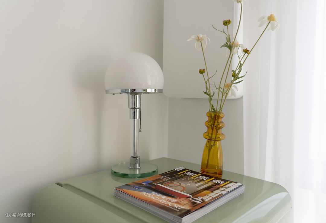 纯白纱帘与慵懒的沙发,打造了阅读角的舒适。一个随意躺下的沙发。草绿植物是代表生命力的符号,仿佛春回大地,纯白沉默的雪山,又有生机勃勃的一隅绿洲。