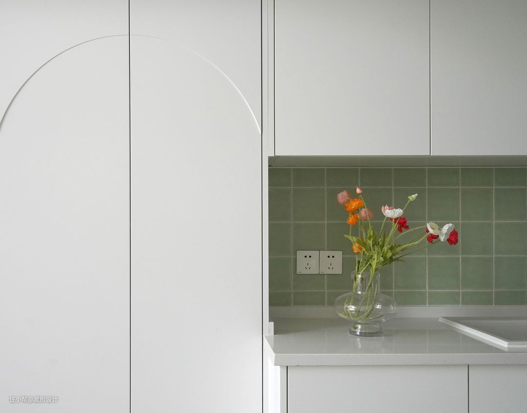 复古绿瓷砖搭配极简的橱柜,和谐的材质与暗含秩序的造型线条,品质感悦然而升