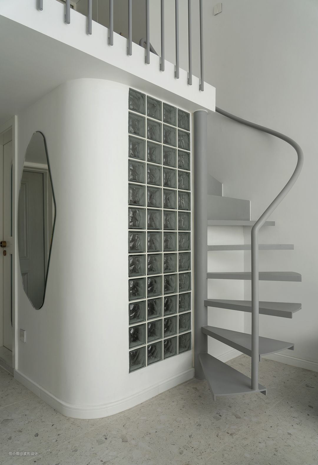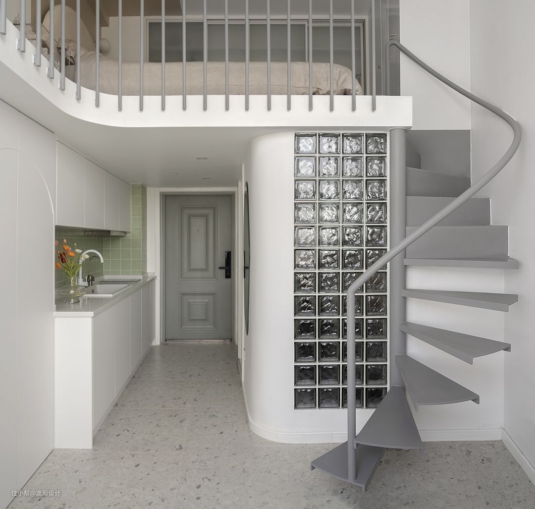 一米4直径的楼梯,在狭小的空间使用上做到最大化。 楼梯扶手及踏板是现场工人现做喷漆,工艺难度非常大,整体造价2万