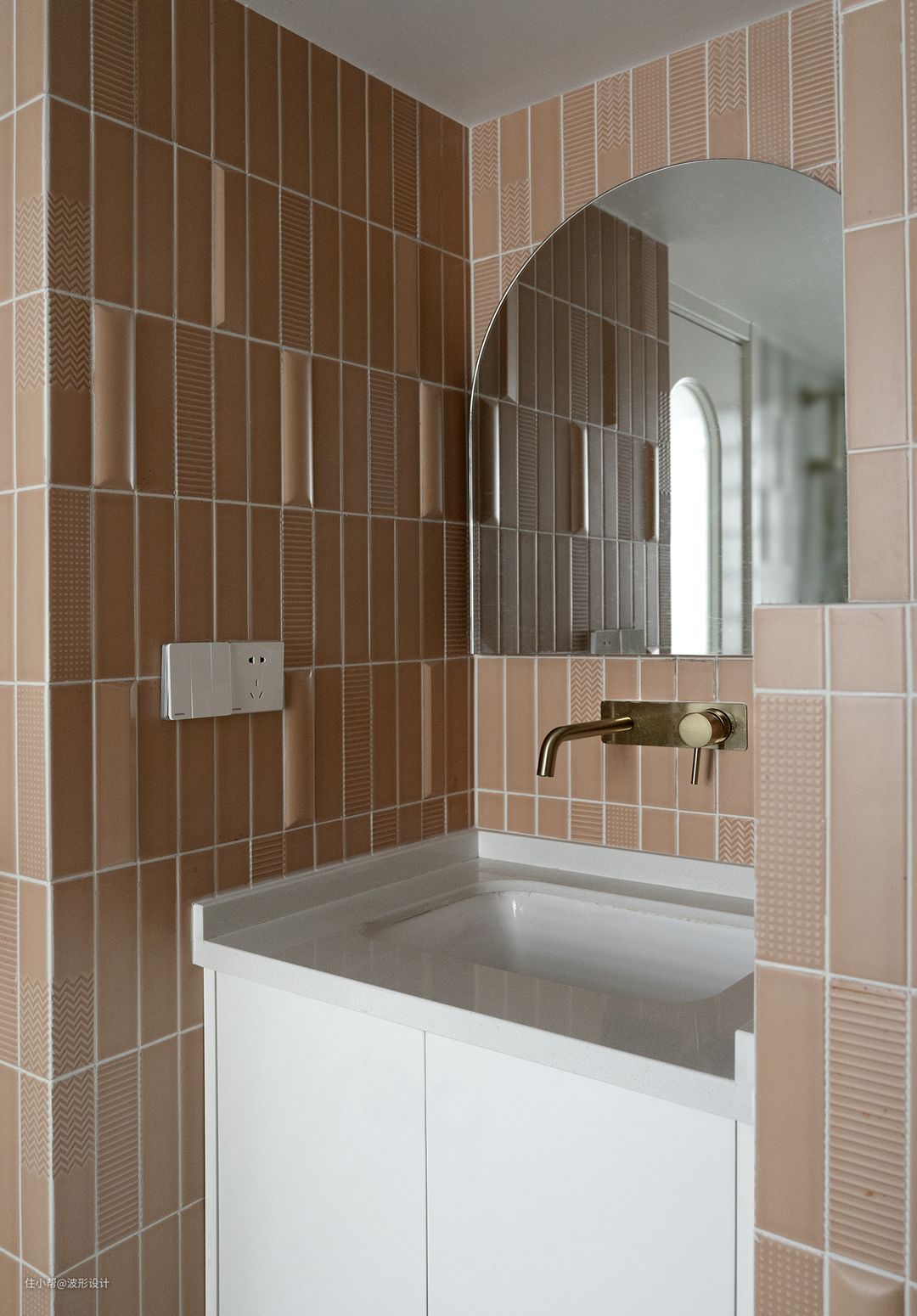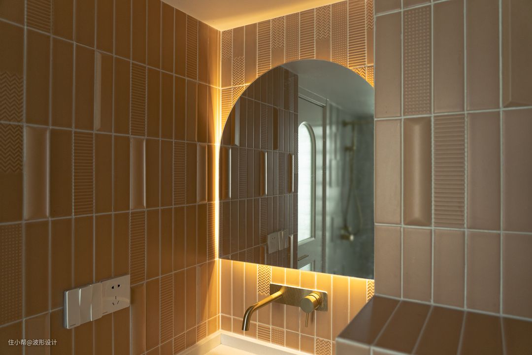 在极小的空间,要满足设计感很有挑战性,具有纹理的小砖最适合不过了,不同的纹理亚光质感不规则排列,又不失精致