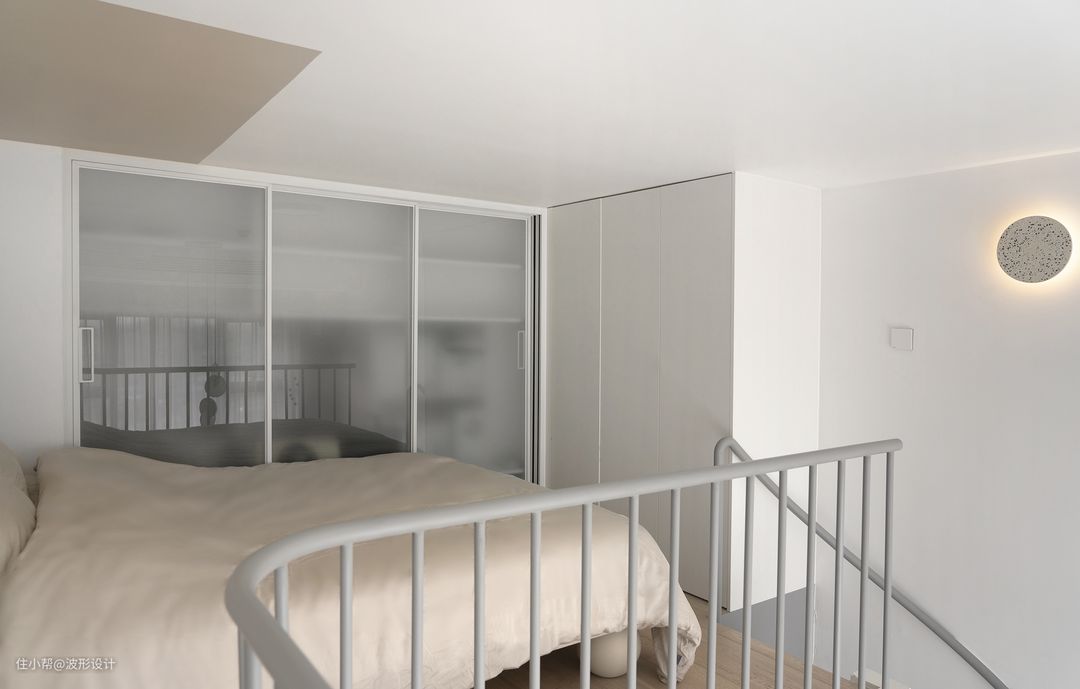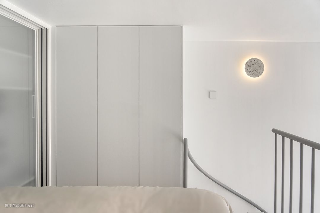 布局介绍: 一楼:进来左侧是卫生间,淋浴,壁挂马桶,洗手台,洗衣机都放置在一个区域,使用上互不干涉,卫生间为了增加采光选用水纹玻璃砖,透光不透人恰到好处。 到客厅右侧有2米多长的大立柜,方便平时放杂物。左侧是超大投影墙,适合迷你家庭影院,楼梯下方存放折叠餐桌椅,方便朋友聚餐不占空间。 二楼:从旋转楼梯上来,左侧及下方拥有两个大衣柜收纳非常充足,右上方延伸处为增加延伸活动空间,能坐着看电影也是方便给猫来回跑。