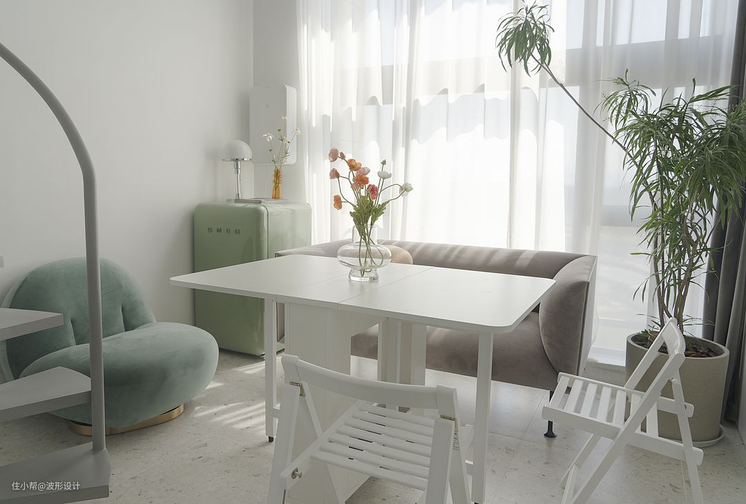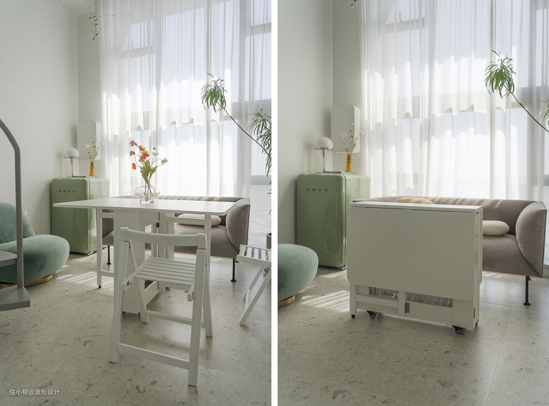 折叠餐桌椅平时用到的机率很小,为朋友来聚餐准备的,非常方便使用不占空间,还能让迷你的空间多个灵活的功能。