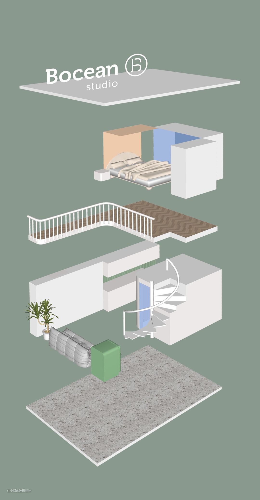 尝试换了一个新的表现方式,结构爆炸图,能直观看到屋内布局结构