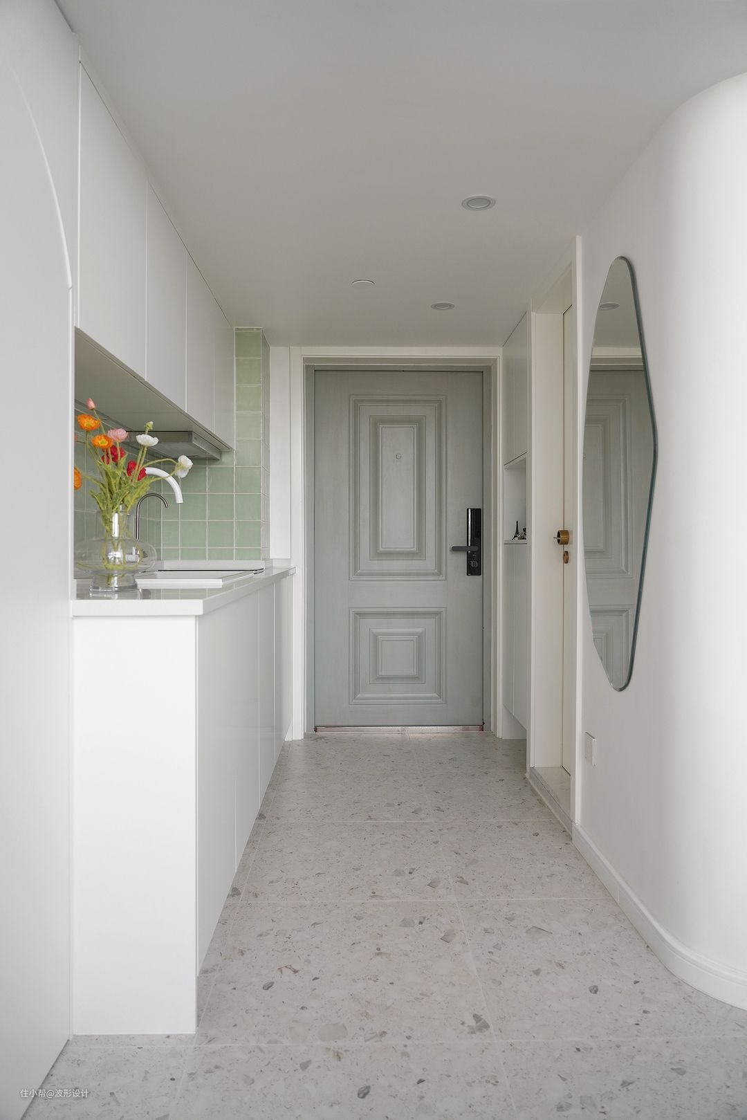 入户沿墙面的玄关柜 异形全身镜,方便换鞋, 时刻检查自己是否穿戴整齐 充足的收纳遵循空间的同一个原则,能藏起来绝不摆出来, 干净、克制。
