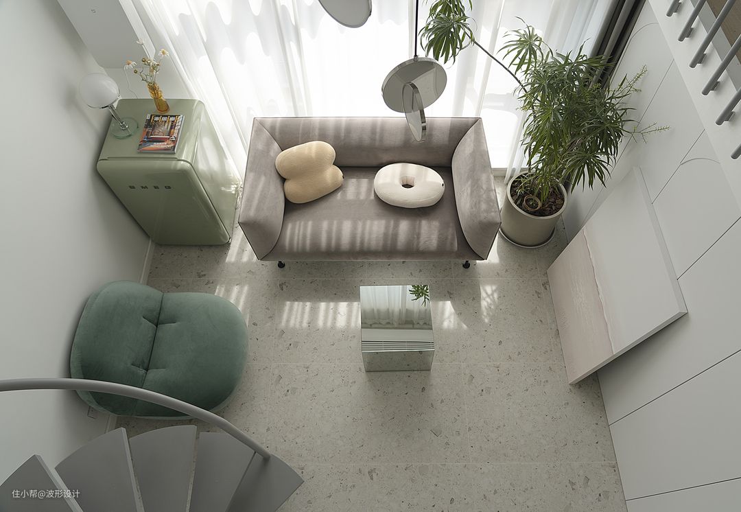 问: 对平面布局做了哪些优化改动,为什么? 答:二楼地面局部向客厅延伸,一般loft大家基本都是浪费掉这个空间的,这个面积不算小,实用性还是挺好的 问: 你对这套作品最满意的地方在哪里,为什么? 答:旋转楼梯从扶手延伸到隔楼,视觉感超好,让仅有实际面积15平米的空间增加特色 问: 在整个装修设计期间遇到最大的挑战是什么? 答:旋转楼梯制作难度很大,弧形扶手工厂里加工好现场焊接,现场安装的时候还是出现的物差,异形对精度要求非常高