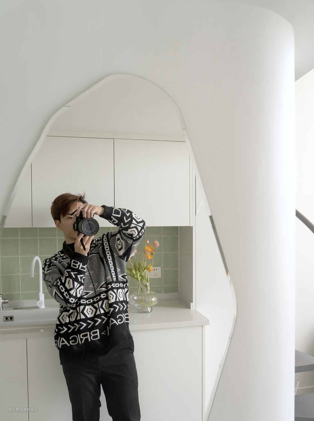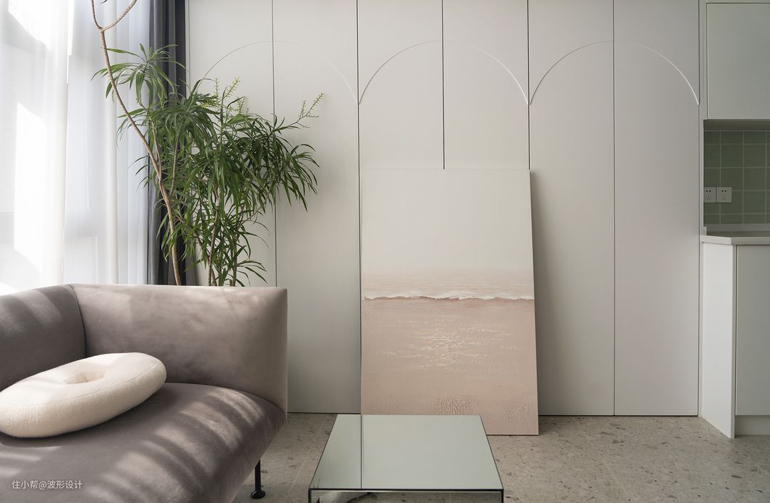 从厨房沿墙面延伸的柜体与白色顶面融于一体,柜体门板做了异形处理,显得极具特点。 巨大的收纳隐若无物。目之所及保持的整洁感,让人一下子放松、平静下来。
