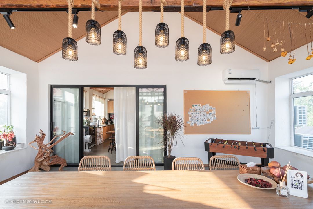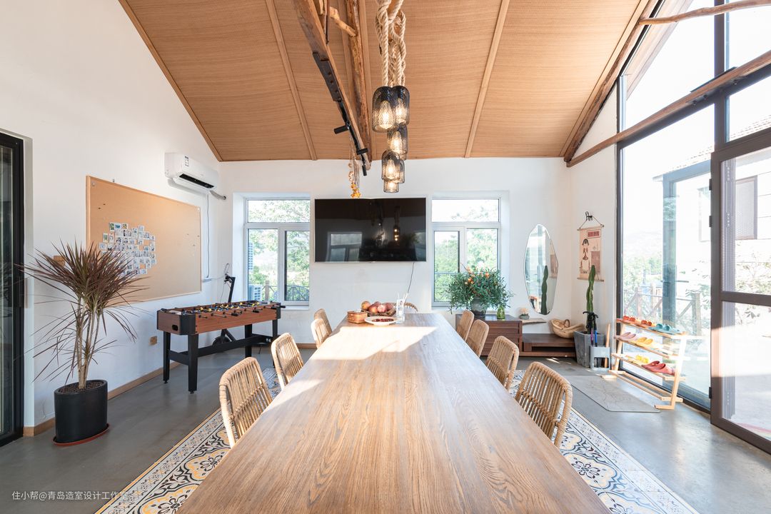 ⧠ 餐桌直冲电视,这里可以作为接待工作时候讲方案演示ppt的场地。我们不希望我们和业主的沟通必须是在一本正经的环境中,因为本身我们做家庭室内设计,反而在一种放松舒适的环境下更有利于彼此的真实交流。 #餐厅 #餐桌椅 #桌上足球 #照片墙 #小米电视 #竹席吊顶