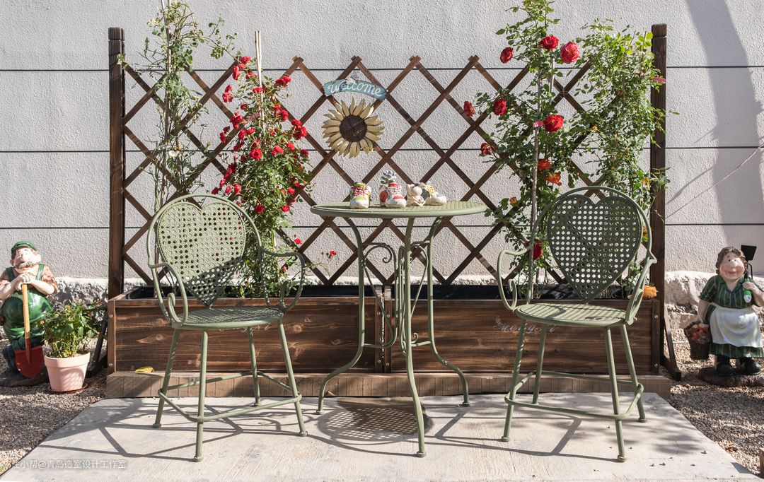 ⧠ 入户玻璃落地窗外在打地面的时候特意多留出一个区域,用来放一对桌椅。明年当月季爬满花架,这里应该拍照不错呢。#庭院 #种花 #铁艺桌椅
