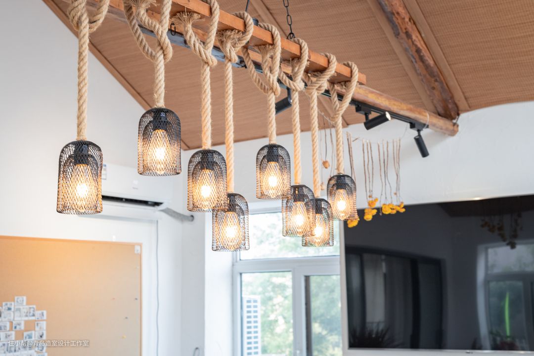 ⧠ 通往内部活动区是一组玻璃推拉门,这面墙是在改造过程中新起的,之所以推拉门建在左边,是 因为右边内部有一组落地书架,而外面这面墙就可以用来做软木垫照片墙使用。上面既可以展示我们的设计作品,同样也会将来到这里的人留念下来,以及我们平常生活的动态。 #吊灯 #铁艺吊灯 #根雕 #照片墙