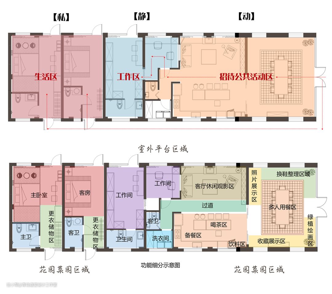 ⧠ 在平面规划方面,我们采用动、静、私三个模块将整个空间分为三个部分。 ⧠ 我们将整个通长空间分为三个大部分:招待及公共活动区域——工作区——生活区 ⧠ 并且三个空间的私密性是依次越来越强的。 工作区与公共活动区相连,生活区则与前面两个区域完全相隔开,以保证隐私性。 同样为我们居家办公的工作方式增加一点仪式感。 因为不想休息区和办公区相隔太近,也会增加人的惰性。 ⧠ 活动区我们分成了两个部分。 前半部分进门处用落地大玻璃做成南向阳光房,增加了空间视野和采光。 这个位置用来招待朋友和客户。工作时,这个位置成为洽谈区,墙面有电视和案例照片墙辅助洽谈。 而聚会时,这个地方又可以成为聚餐吃饭的大饭桌。可以同时容纳10-15人。 后半部分是沙发落座区、阅读区、开放式厨房及喝茶区。 用以服务和分流前面用餐区的一个内部休息区。 ⧠ 最终,我们规划出符合我们所有要求的最优布局方式。 虽然大空间是方方正正的,但是通过大空间划分,再细化到每个空间小划分,每面墙面的用途思考,以人在空间中走动演绎的方式,会发现这个空间的很多细节问题。推荐给正在纠结平面布局的住友们。