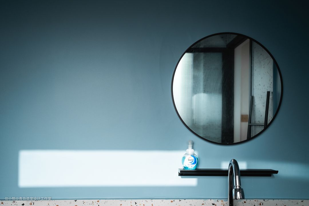 ⧠ 洗手区采用贴半砖的形式,上半部分墙体刷蓝色防水乳胶漆。#卫生间 #洗手台