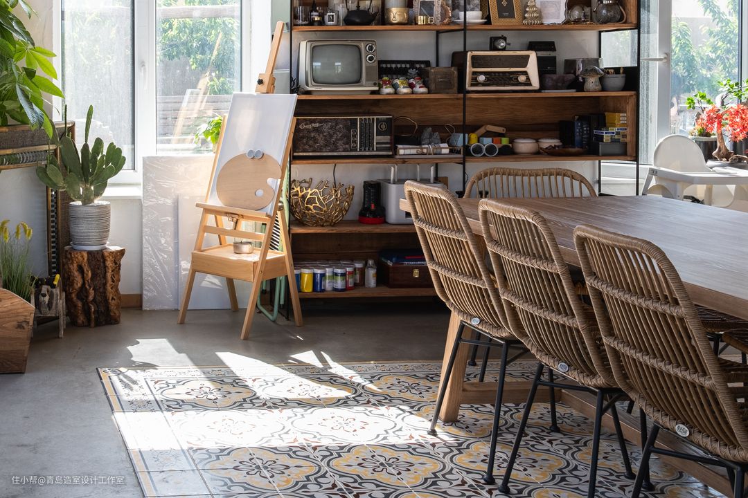 ⧠ 同时,这里又是我们平常的吃饭聚餐区,我和卢设计都非常喜欢很认真的吃早饭,所以我们经常会在没有紧急工作安排的日子起床后,做一顿很丰盛的早餐,在这里一边看早间新闻,一边吃完并看着窗外发一会呆。 或者是朋友客户来聚餐的日子,这里更是热闹,三米长的餐桌上摆满大大小小的盘子,有些人还要搬吧凳过来穿插着做。孩子们有的在旁边跑来跑去,有的在玩桌上足球,大人们悠闲地吃着饭。 #餐厅 #花砖 #餐桌椅