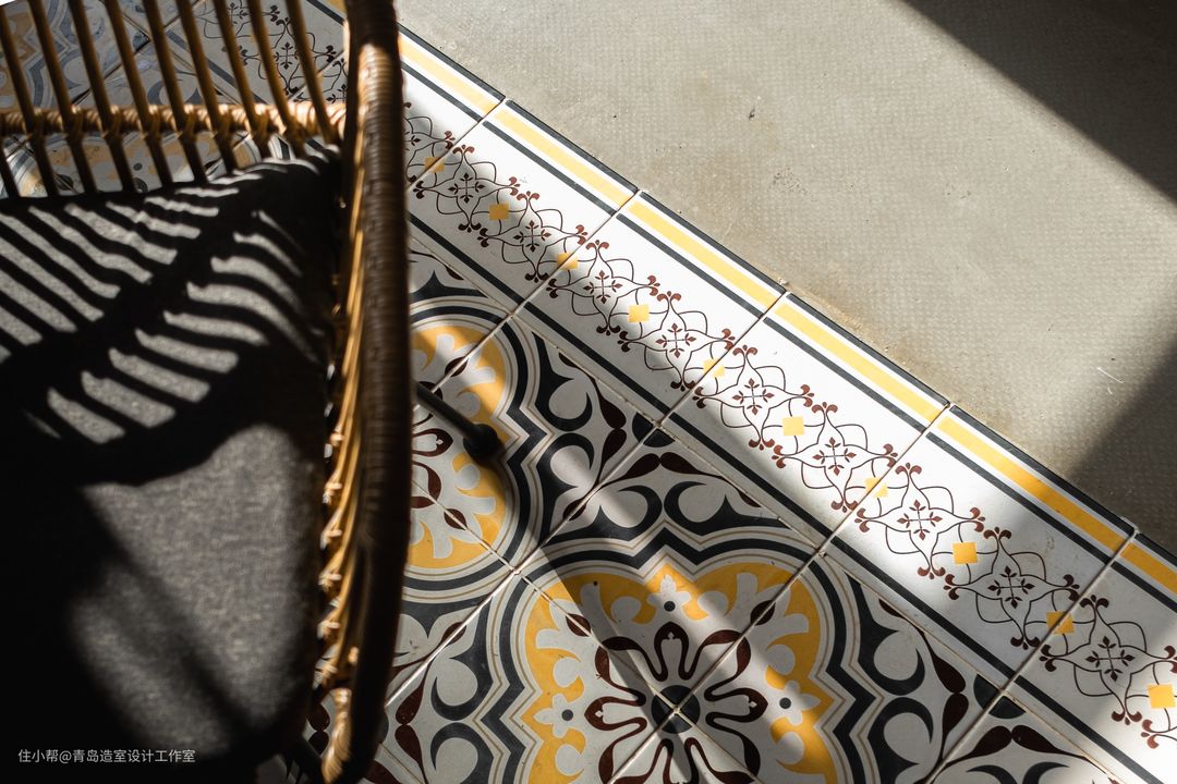 ⧠ 椅子和花砖和光线的组合。 花砖是在网上采购的,屋内大部分的地面时水泥地面,只在餐桌的下面做了区域性的花砖,也是为了起到空间划分的效果。 #花砖 #水泥地面
