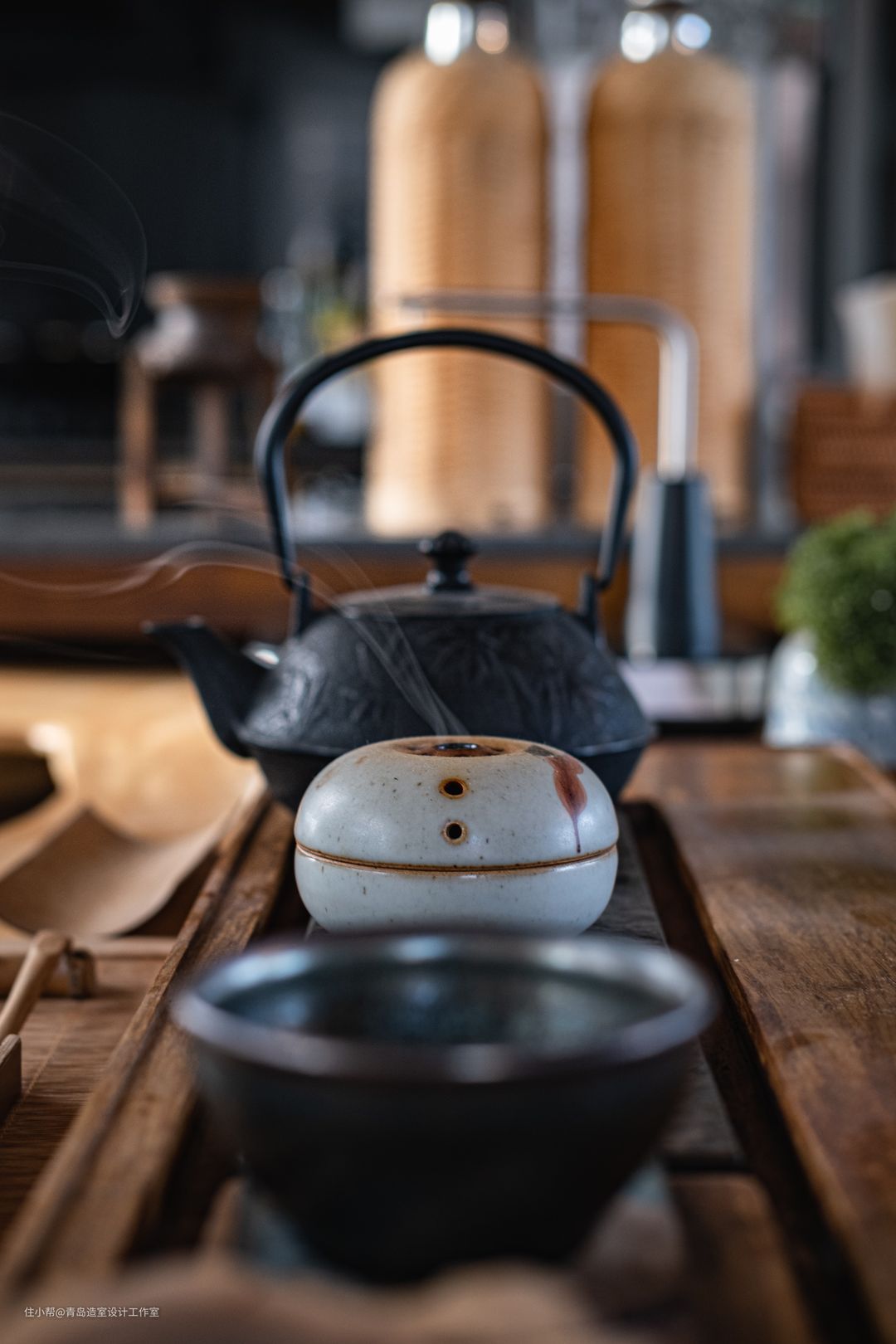 ⧠ 岛台的侧面放一个整木的茶桌,因为茶盘平常不方便来回收纳,所以放在外面大餐桌会很不方便。所以在室内添置了这么一个茶台区。同样为客厅会客功能做辅助。 #茶室 #茶具
