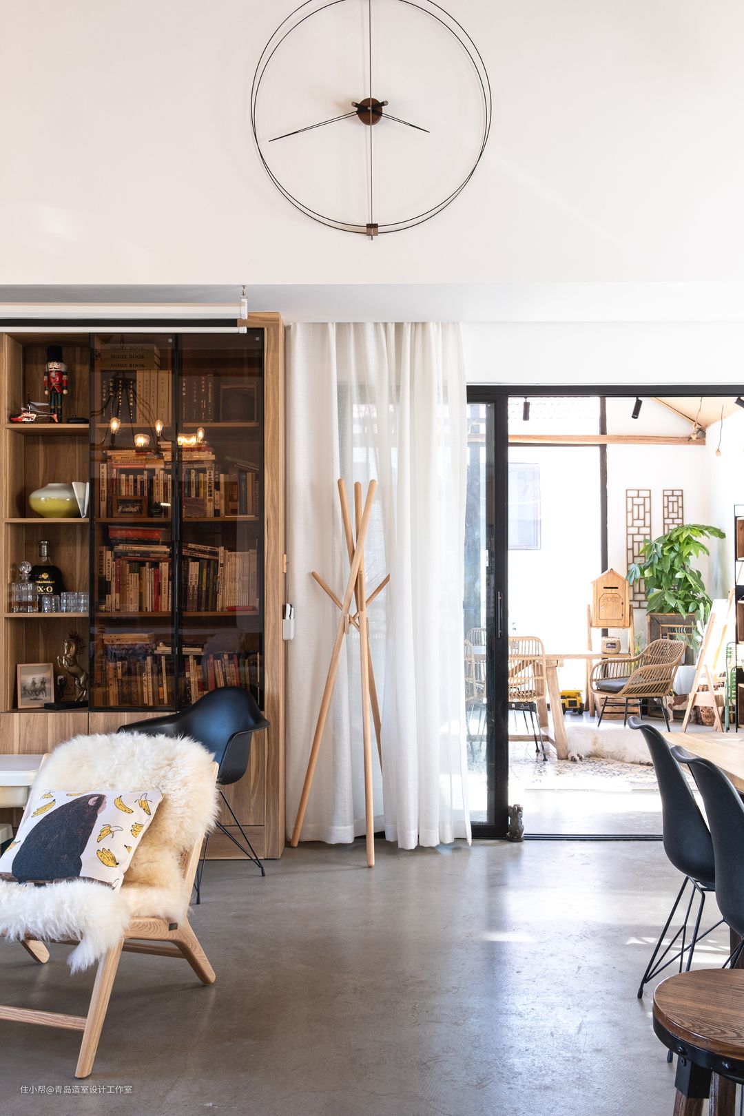 ⧠ 白天,投影幕会拉起来,将两扇活动的玻璃门推到两侧,内部活动区和外部活动区就形成了一个大的空间。宽敞明亮,空气流畅。书柜并没有做成全部封闭或全部开敞。而是在左右两组柜子加玻璃柜门,用来放书,也防止落灰,而中间两组做开敞式,用来做展示。 #挂表 #窗帘 #读书区 #单椅 #衣架 #书柜