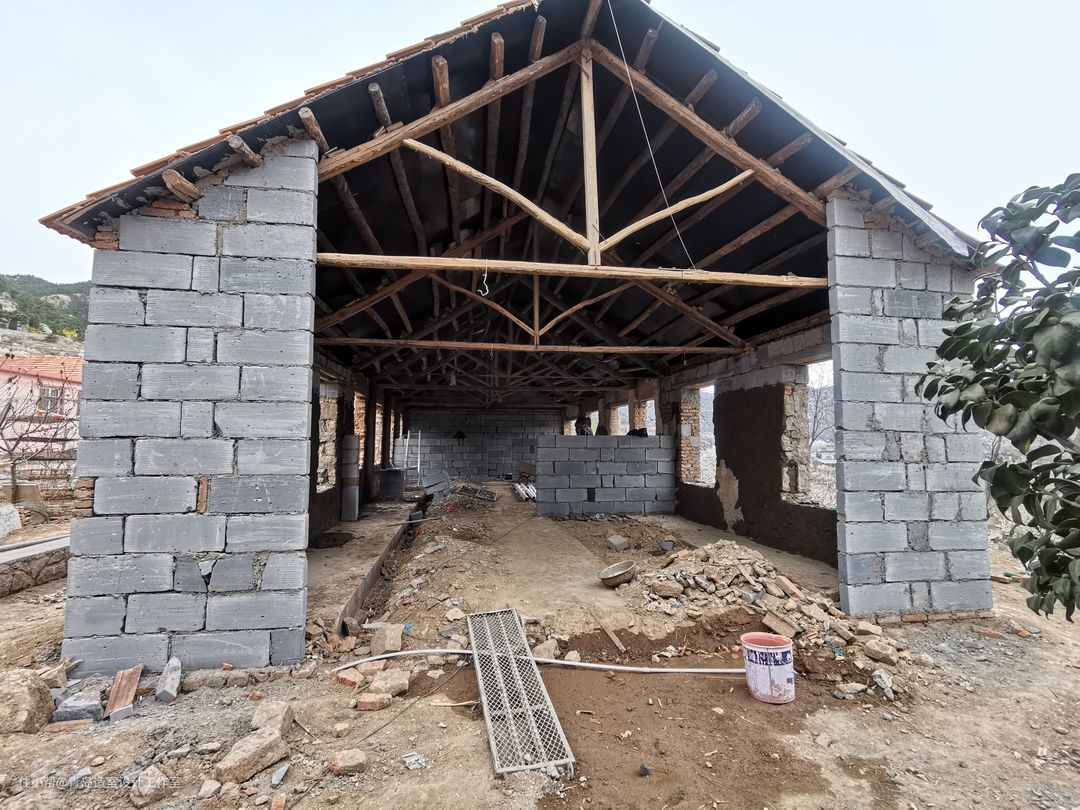 ⧠ 房子的屋顶曾经是草盖起来的,瓦片挂在上面摇摇欲坠,木梁的造型却是我们喜欢的形式。 但是屋内的味道和墙壁的剥落情况让我们知道这里的改造不是一件容易的事情。地面上有两条沟槽。 是小鸡们的活动场地,房东说自从非典过后,村子里已经不让养鸡了。所以房子也因此空置了下来。 ⧠ 家人朋友对这个房子的改造都不抱很大希望,甚至觉得这是不可能的事情。我们也想了很多方法怎么做空间的杀菌祛味,用一些相对简单的方式来做房子的硬装设计与施工,把更多的资金用于软装饰上。